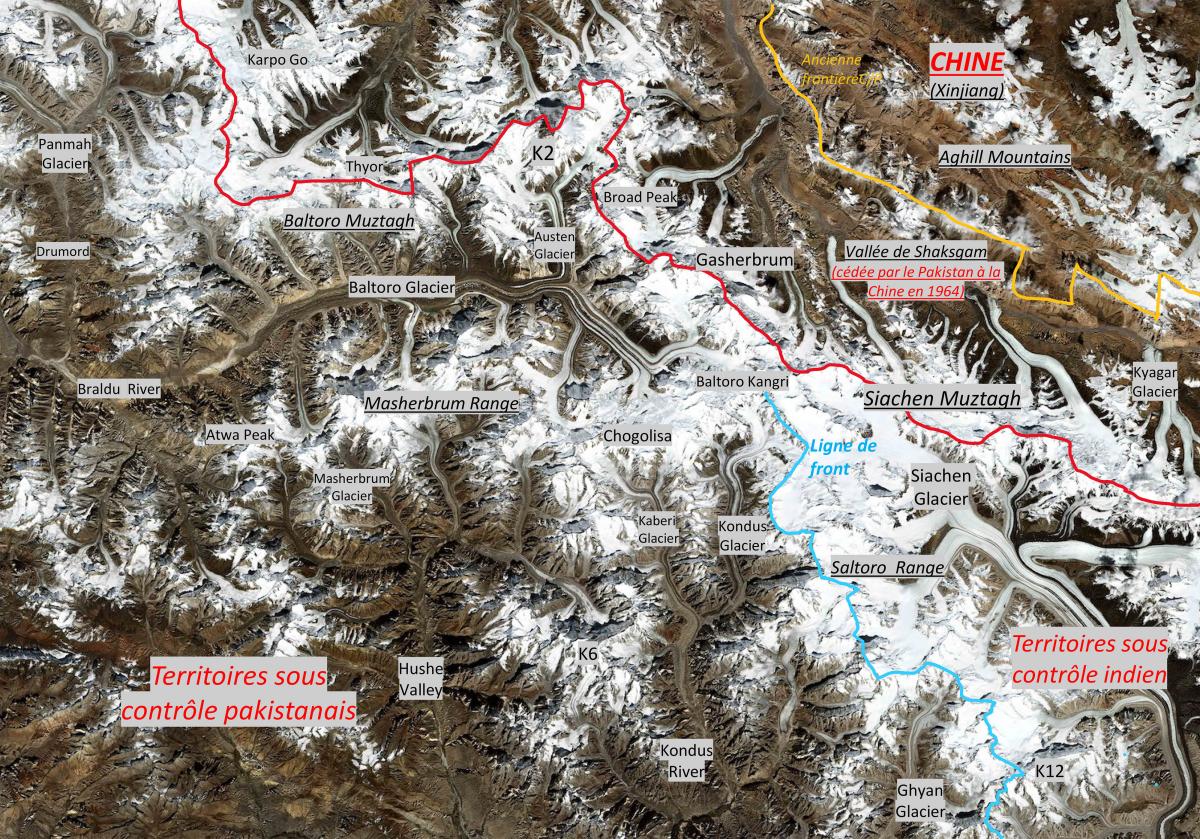 Dans l’ouest de l’Himalaya, la vaste chaine du Karakoram est dominée par le massif du K2 (8611 m.) qui est le second plus haut sommet du monde derrière l’Everest (8848 m.). Dans une région qui pourrait être un paradis pour les alpinistes, trois puissances asiatiques sont pourtant en conflits frontaliers depuis les années 1950 pour le contrôle de ces hautes terres glacées désertiques. A la rivalité géopolitique sino-indienne sur la vallée de la Shaksgam et l’Aksai Chin, situé plus au sud-est, se superpose la rivalité entre l’Inde et le Pakistan sur le Cachemire, une région aujourd’hui coupée en deux par une ligne de contact militarisée. Le conflit porte ici tout particulièrement sur le triangle constitué par le Glacier Siachen, aujourd’hui sous administration indienne mais que revendique le Pakistan. Les deux armées s’y affrontent régulièrement de manière sporadique dans des conditions tactiques très difficiles du fait de conditions extrêmes.