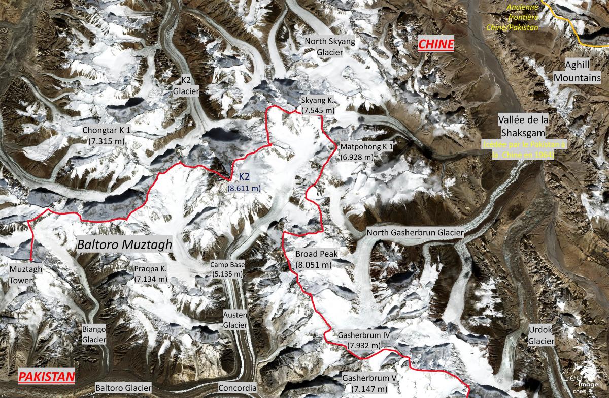 A ceci s’ajoute la volonté de la Chine de se projeter le plus loin possible de ses bases historiques traditionnelles comme puissance continentale et mondiale. Dans ce contexte, le découpage de ses frontières avec le Pakistan et l’Inde sont des enjeux géopolitiques majeurs et le contrôle de la vallée de la Shaksgam, comme nous l’avons vu, un enjeu géostratégique considérable. Sur cette image, le couloir acquis par la Chine auprès du Pakistan et qui s’étend du Broad Peak aux sommets des Aghill Mountains fait 22 km de large.