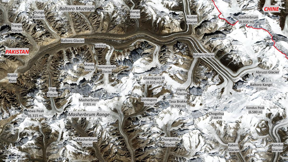 Cet ensemble de très hauts sommets mondiaux est historiquement un des paradis de l’alpinisme mondial depuis les grandes premières réalisées dans les années 1950 et demeure encore aujourd’hui un ensemble très attractif. On trouve ainsi sur l’image le Gasherbrum 1 qui atteint 8.080 m. d’altitude, ce qui en fait le sommet n° 11 mondial, et qui a été conquis en 1958. On trouve aussi, par exemple, le Broad Peak (8047 m, n° 12, 1957), le Gasherbrum II (8035 m, n°13, 1956), le Gasherbrum III (7946 m, 1975), le Gasherbrum IV (7932 m, n°17, 1958), le Masherbrum (7821 m, n°11, 1960) et le Chogolisa (7665 m, n°36, 1975).