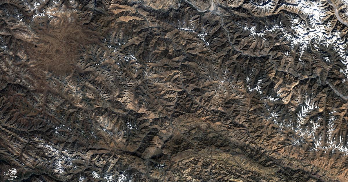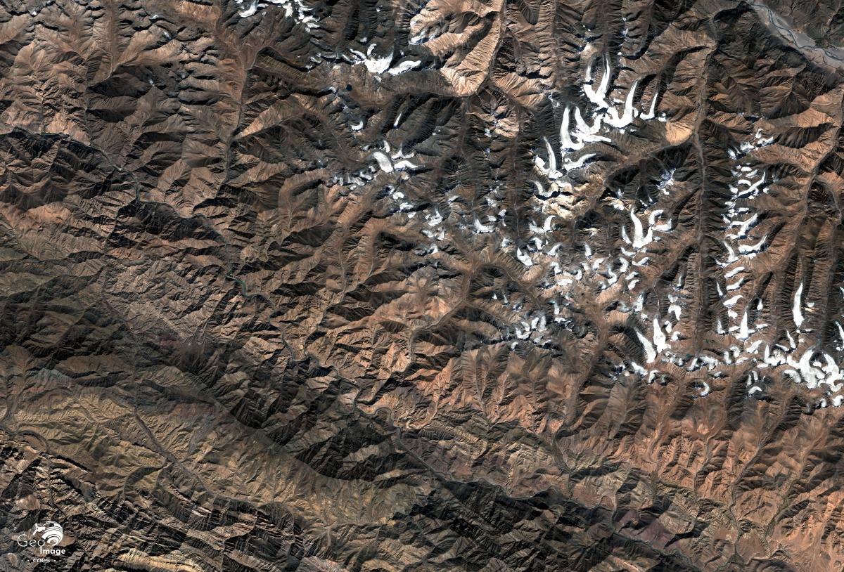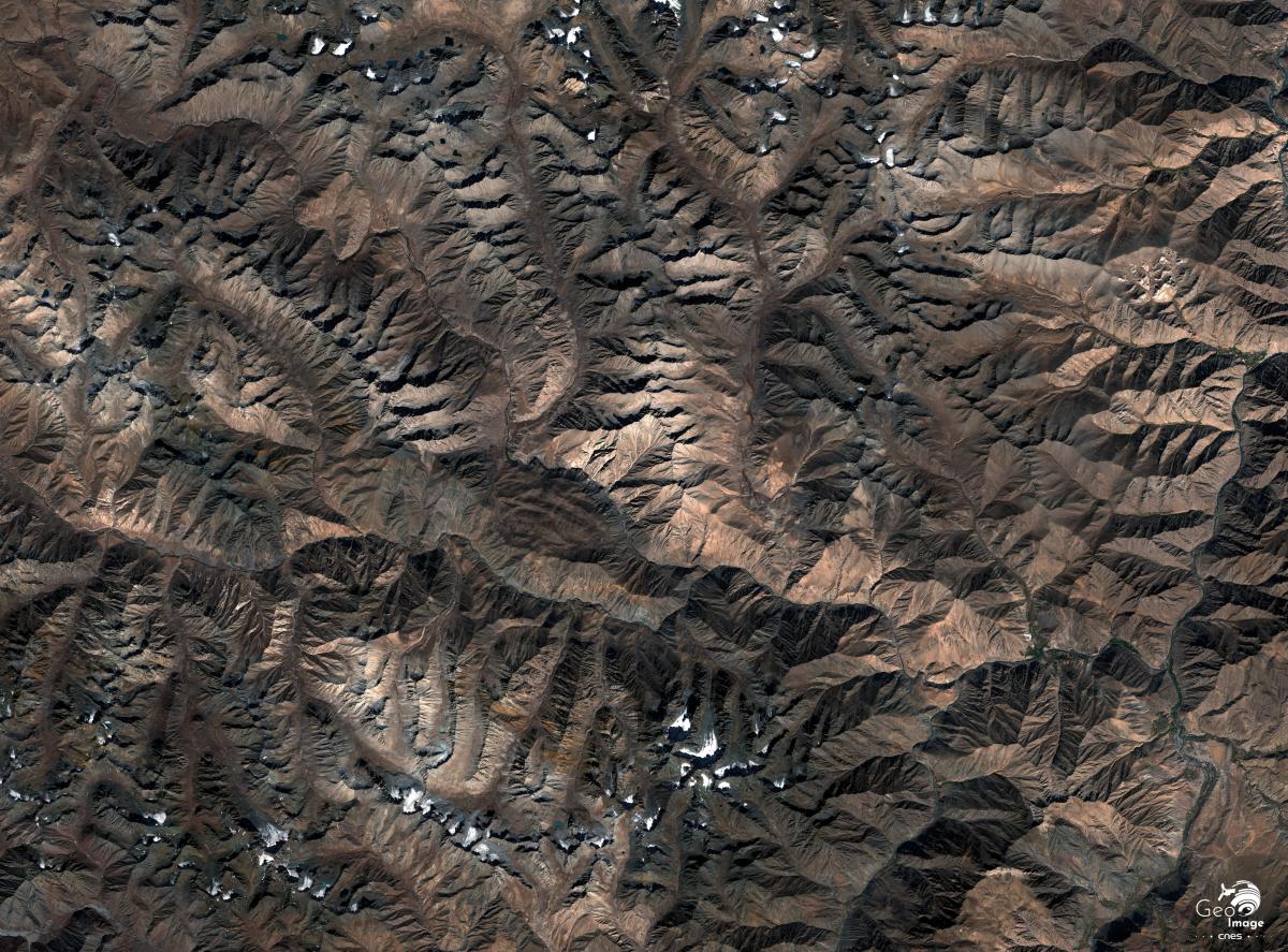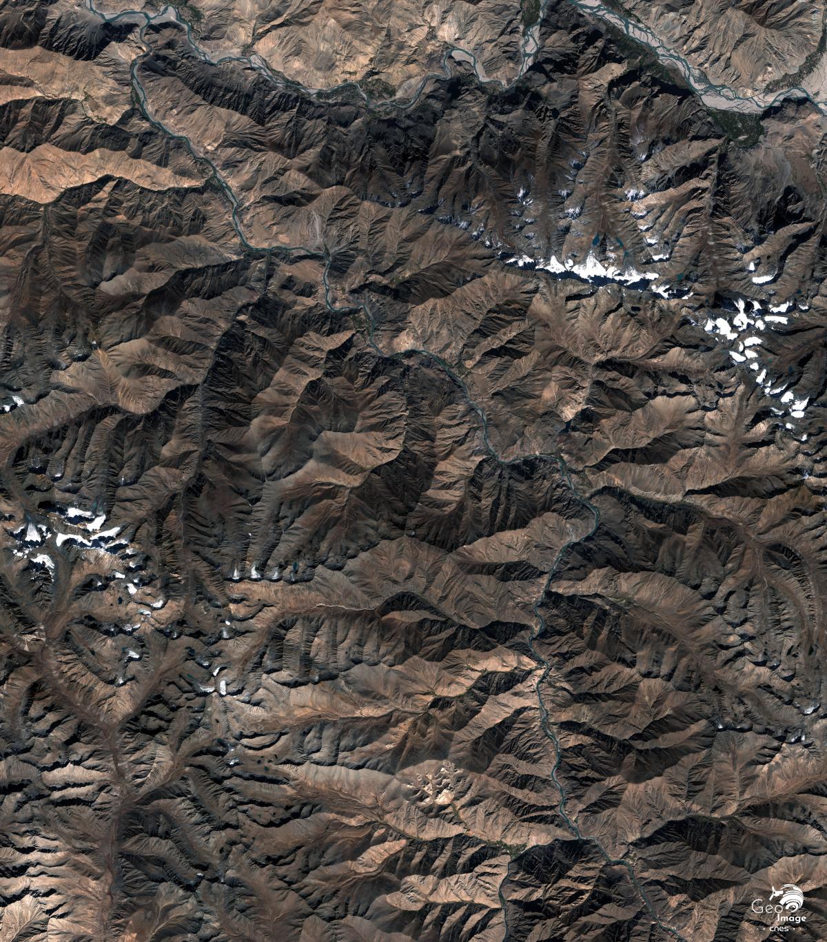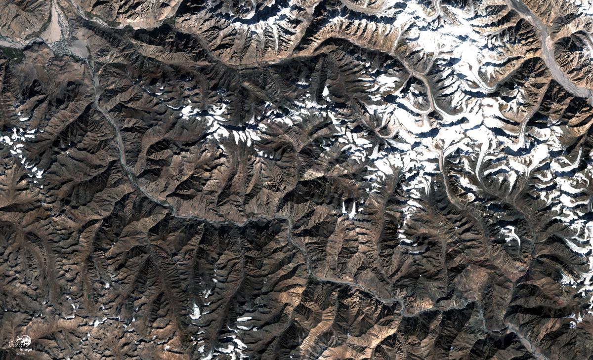 Si cet espace n’atteint pas les hauteurs exceptionnelles de la Karakoram Range et de la région du massif englacé du K2 qui se trouvent plus au nord (hors image), les altitudes moyennes demeurent encore très élevées puisqu’elles s’étagent entre 4500 et 5500 m. Comme on peut le constater, l’image se caractérise donc par la juxtaposition de très hautes chaines, de très hauts plateaux et de vallées très encaissées. Cependant, l’absence de très grands glaciers - et donc de très grandes vallées glaciaires - rend l’organisation régionale plus confuse qu’au nord.