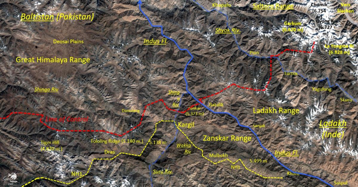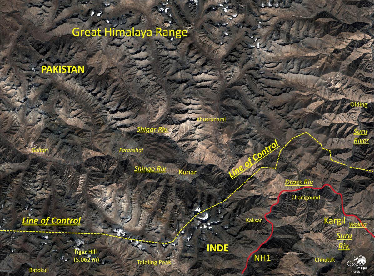 Couvrant toute la région frontalière de la LDC dans la région de Kargil, l’image s’étend du massif de Tiger Hill (4.820 m) à l’ouest au sud du massif de la Saltoro Range à l’est. On distingue bien successivement d’est en ouest les grandes chaines et les grandes vallées organisant l’espace régional selon une ligne directrice Sud-Est/ Nord-Ouest : la Saltoro Range, la vallée de la Shyok, la Ladakh Range, la vallée de l’Indus, la Zanskar Range, la vallée de la Suru puis enfin la Great Himalaya Range.
