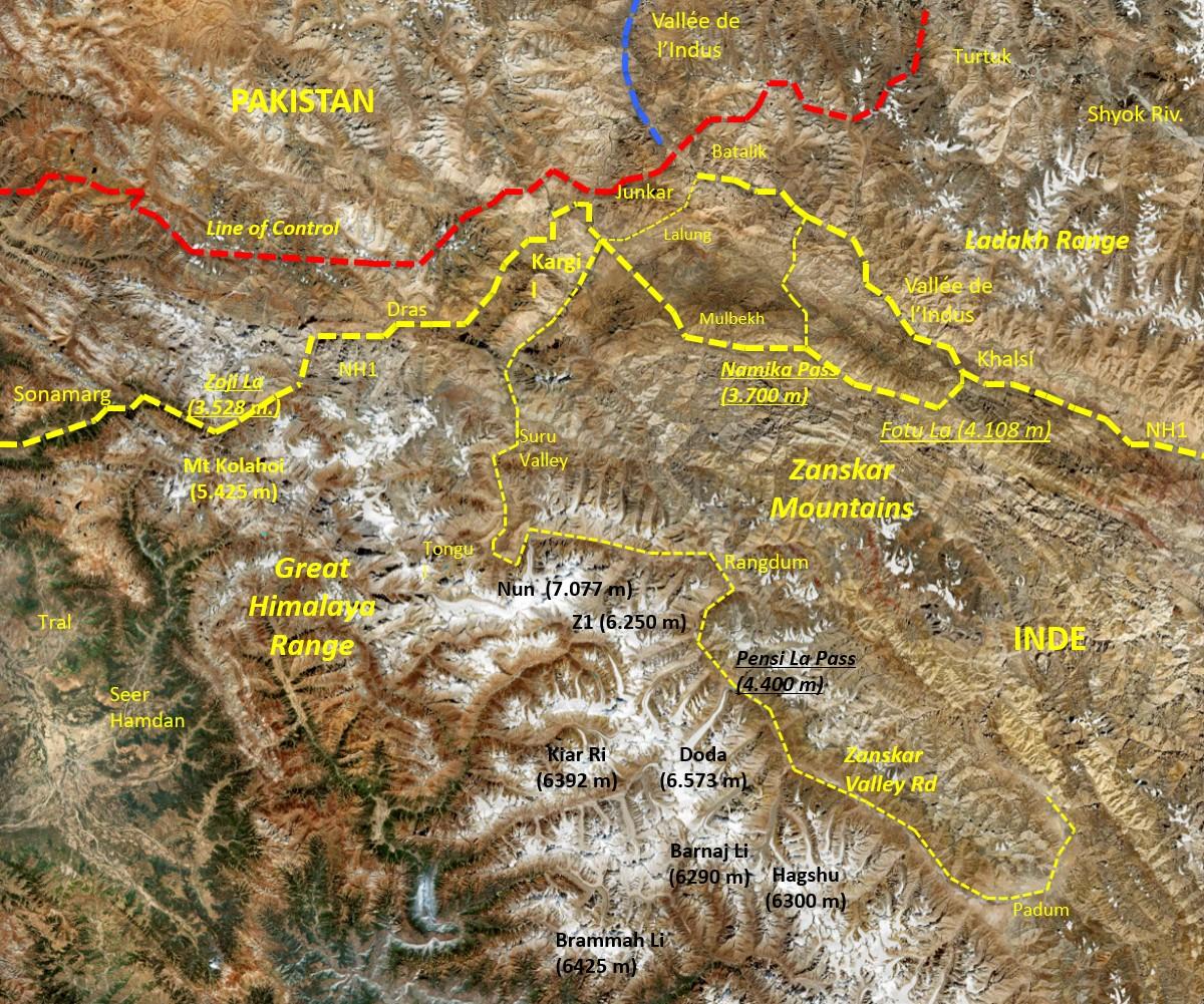 Afin d’assurer la continuité territoriale, le contrôle de la région et la bonne circulation et le soutien des troupes stationnées dans ces territoires, l’Inde a été contrainte de réaliser une impressionnante infrastructure routière Ouest/Est : la National Highway-1A - NH1. Ce véritable cordon ombilical passe sur l’image par Sonamarg, Dras, Kargil puis Khalsi en utilisant les vallées de la Drass, de la Suru et de l’Indus.
