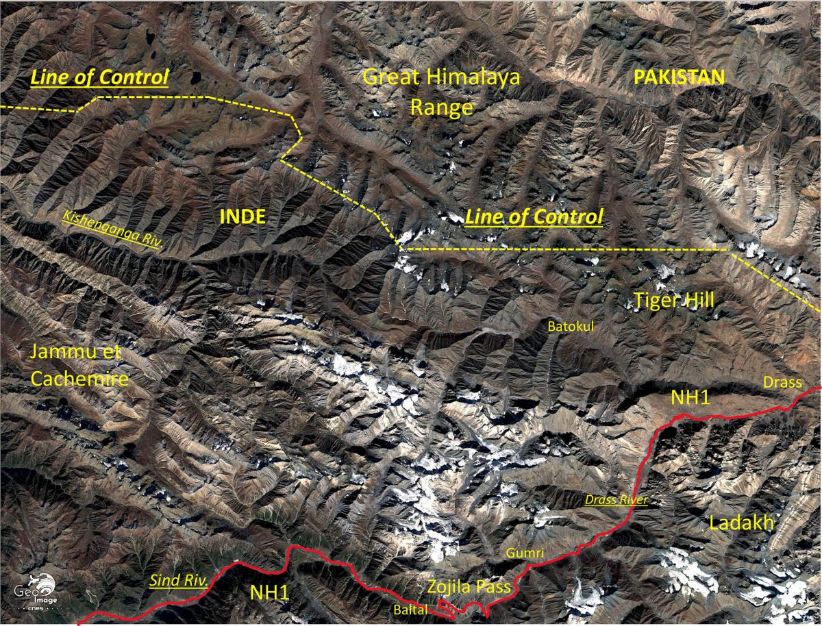 Cet axe Srinagar - Leh est pour l’Inde d’un intérêt essentiel dans la mesure où il constitue le seul axe terrestre de qualité. Mais il est géographiquement très proche de la Line of Control qui sépare les armées des deux pays. C’est dans cette région que les forces pakistanaises ont en 1999 mené leur offensive afin de menacer, voire couper, cet axe. Comme le montre bien l’image, le Tiger Hill - perché à 4.820 m. - n’est situé qu’à 8 km de Drass.