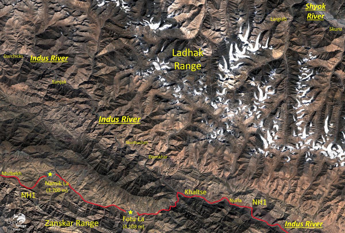 Longue de 534 km, la NH1 est une route géostratégique majeure qui relie la ville de Srinagar et la grande Kashmir Valley, situées à l’Ouest (hors image), à Leh, à l’Est (hors image). A partir de Leh, elle permet surtout d’assurer la présence militaire indienne dans le triangle du Glacier Siachen et la Saltoro Range qui est un territoire pour le contrôle duquel s’affrontent régulièrement les deux armées, indienne et pakistanaise.