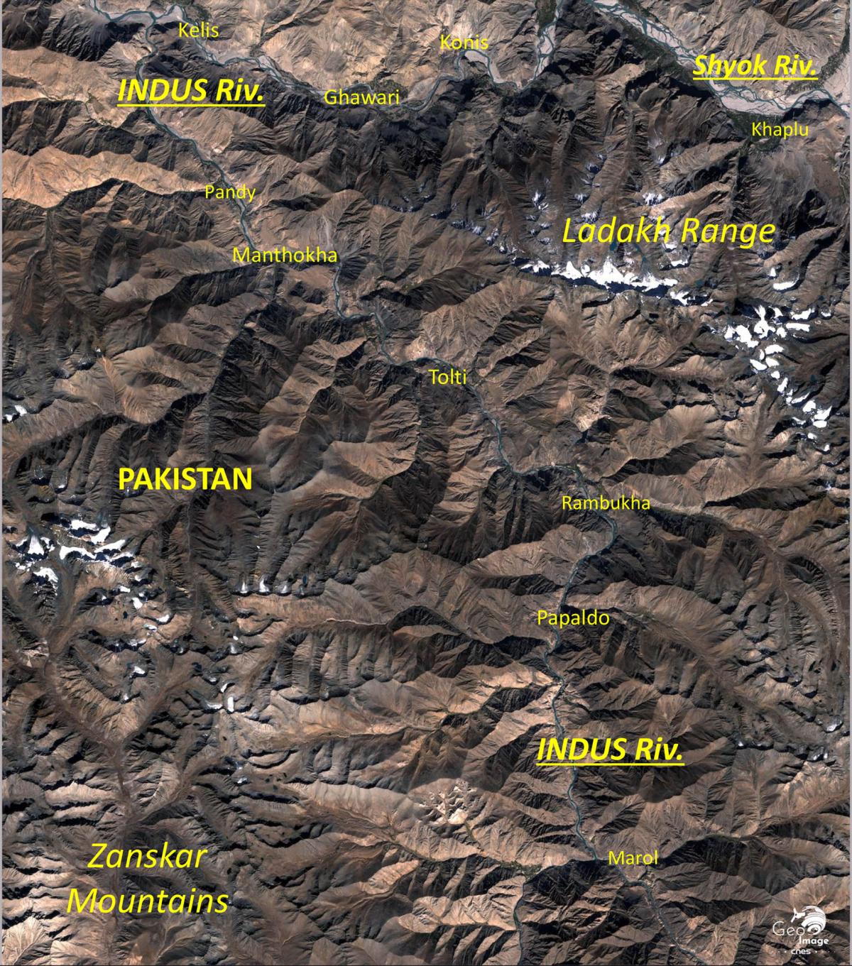 L’image couvre au Nord-Est une partie de la haute vallée de l’Indus. Prenant sa source dans le plateau tibétain à 4255 m pour se jeter dans la mer d’Arabie après avoir parcouru 3180 km et drainé un gigantesque bassin de 1165 million de km², l’Indus est l’un des plus importants fleuves d’Asie du Sud. A l’échelle régionale, cette vallée servait historiquement de colonne vertébrale, avant d’être coupée depuis 1947 par la frontière à la hauteur de Batalik. Posée en position d’abri sur une haute terrasse à 56 km de Kargil, Batalik est en effet devenu pour l’Inde un verrou stratégique qui a été l’enjeu d’importants combats en 1971 puis 1999.