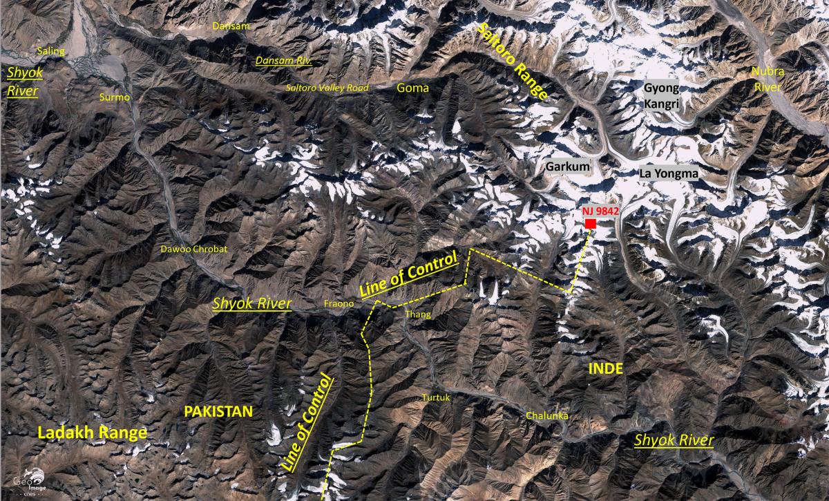 Sur l’image, la définition du tracé de la LOC s’arrête au point NJ 9842, indiqué en rouge, qui se trouve à 6.827 m. d’altitude. En 1973, les négociateurs des deux pays n’ont pu se mettre d’accord au-delà de celui-ci comme l’indique la carte réalisée par Jean-Luc Racine, directeur de Recherche au CNRS, grand spécialiste de l’Asie du Sud. Pour le Pakistan, la limite de la LOC doit filer plein nord-est et aboutir au col Karakoram sur la frontière avec l’Inde. Pour l’Inde, la frontière doit remonter vers le nord-ouest et suivre la ligne de crête de la Saltoro Range pour aboutir à la frontière chinoise entre le Glacier Baltoro et le Col Indira.