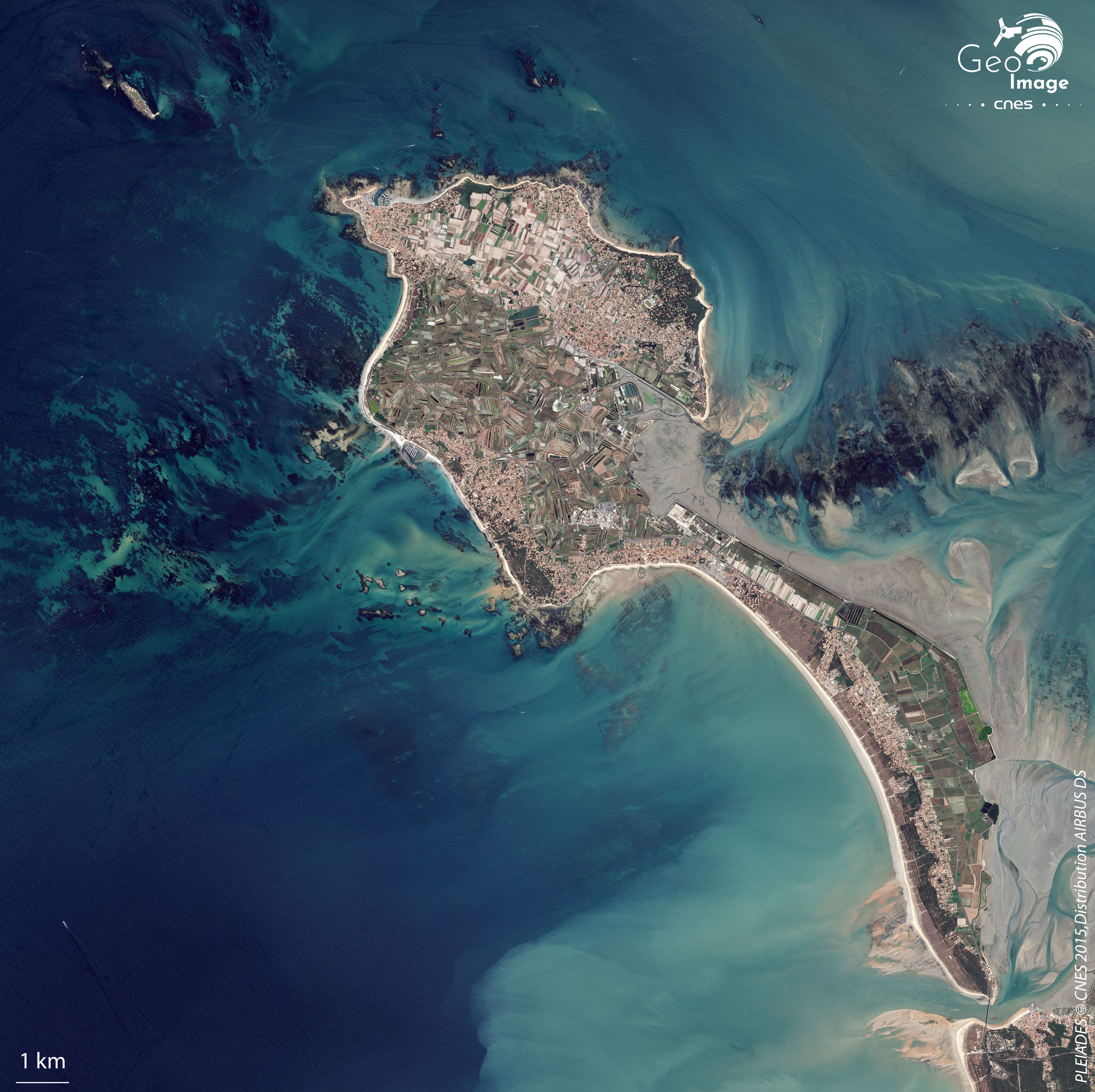 Couverte par l’image, l’île de Noirmoutier est située sur le littoral atlantique, au sud de l'estuaire de la Loire et à l'ouest du Marais Breton. Cet espace insulaire vendéen de 48 km² a une orientation nord-ouest/sud-est et est constitué d'un socle rocheux cristallin au nord sur lequel s'est développé un long cordon dunaire visible sur l'image. Cette flèche sableuse, qui s’est mise en place sous l’action des vents et des courants, a isolé la Baie de Bourgneuf et permis l’accumulation de sédiments formant des zones de marais et donnant à l’île sa structure caractéristique.