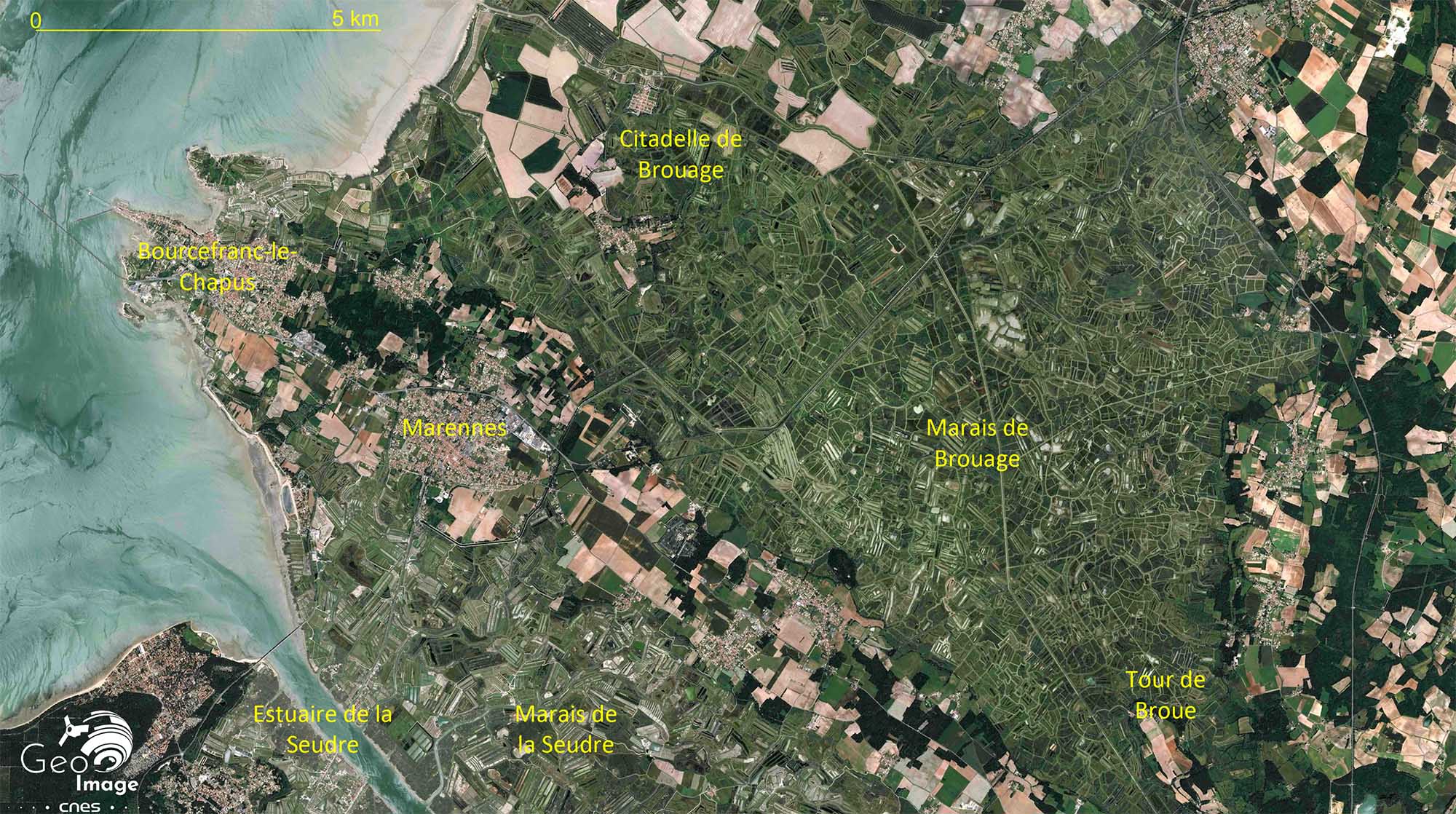 Cette image du marais de Brouages, a été prise par un satellite Pléiades le 18 mai 2020. Il s’agit d’une image en couleur naturelle, de résolution native à 0,70m, ré-échantillonnée à 0,5m.