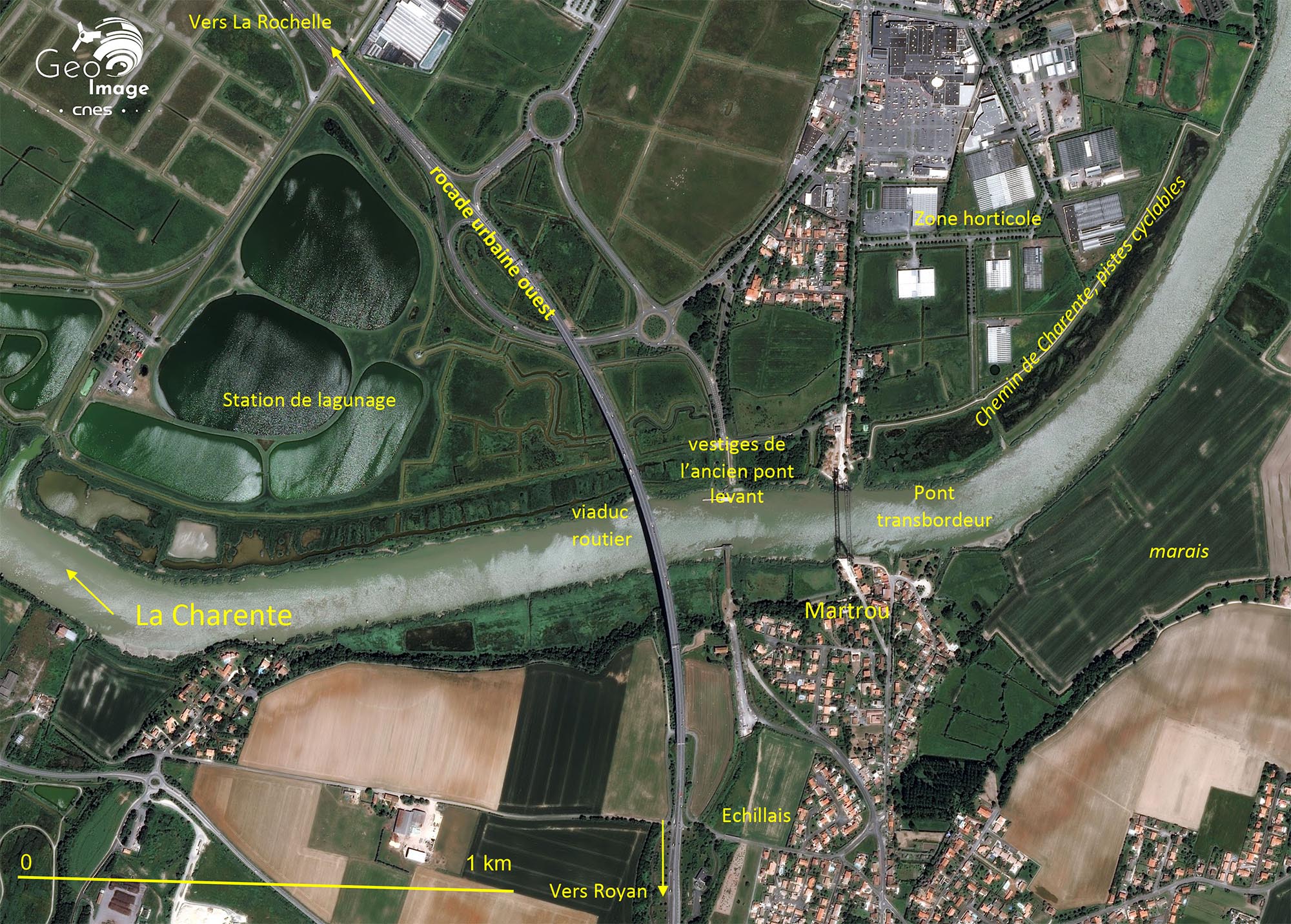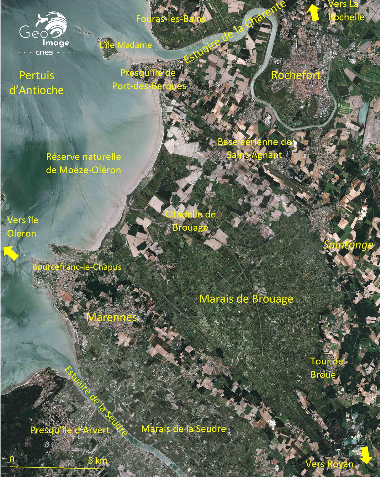 L’image satellite nous laisse clairement entrevoir au nord les méandres de la Charente. Le fleuve se heurte à des roches calcaires le contraignant à changer de direction. Cette sinuosité du fleuve donne un caractère singulier à ce paysage estuarien, qui serpente dans un ancien golfe au cœur d’un archipel d’anciennes îles (Rochefort, Breuil-Magné, Saint-Laurent de la Prée, Fouras…) avant de rejoindre le pertuis d’Antioche.