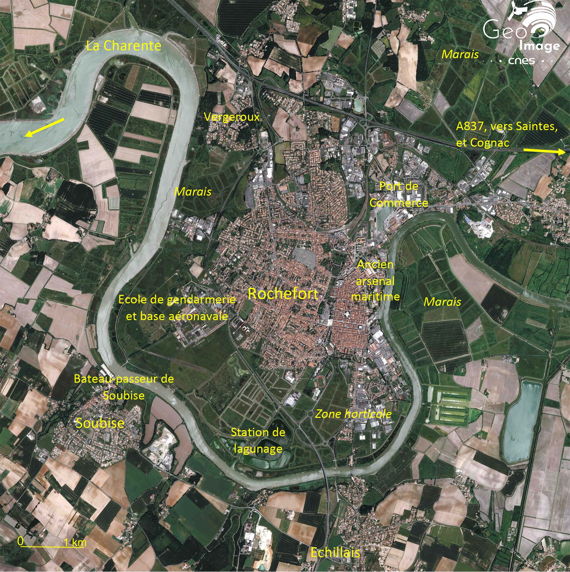 Au nord de l’image satellite, la ville de Rochefort se distingue clairement. Elle s’est développée dans un méandre de la Charente, rive droite, à une vingtaine de kilomètres de la côte atlantique. Au XIe siècle, “Roccafortis” est un château dominant la Charente au cœur d’un marais, entouré de quelques chaumières. En 1666, sur ordre de Louis XIV, les restes du château de Rochefort sont rasés, dans le but de créer un arsenal de guerre, capable de construire rapidement une flotte, pour rétablir la puissance maritime du royaume contre les Anglais et favoriser le commerce avec les colonies. L’arsenal voit le jour dans ce site stratégique de fond d’estuaire. (cf. zoom).