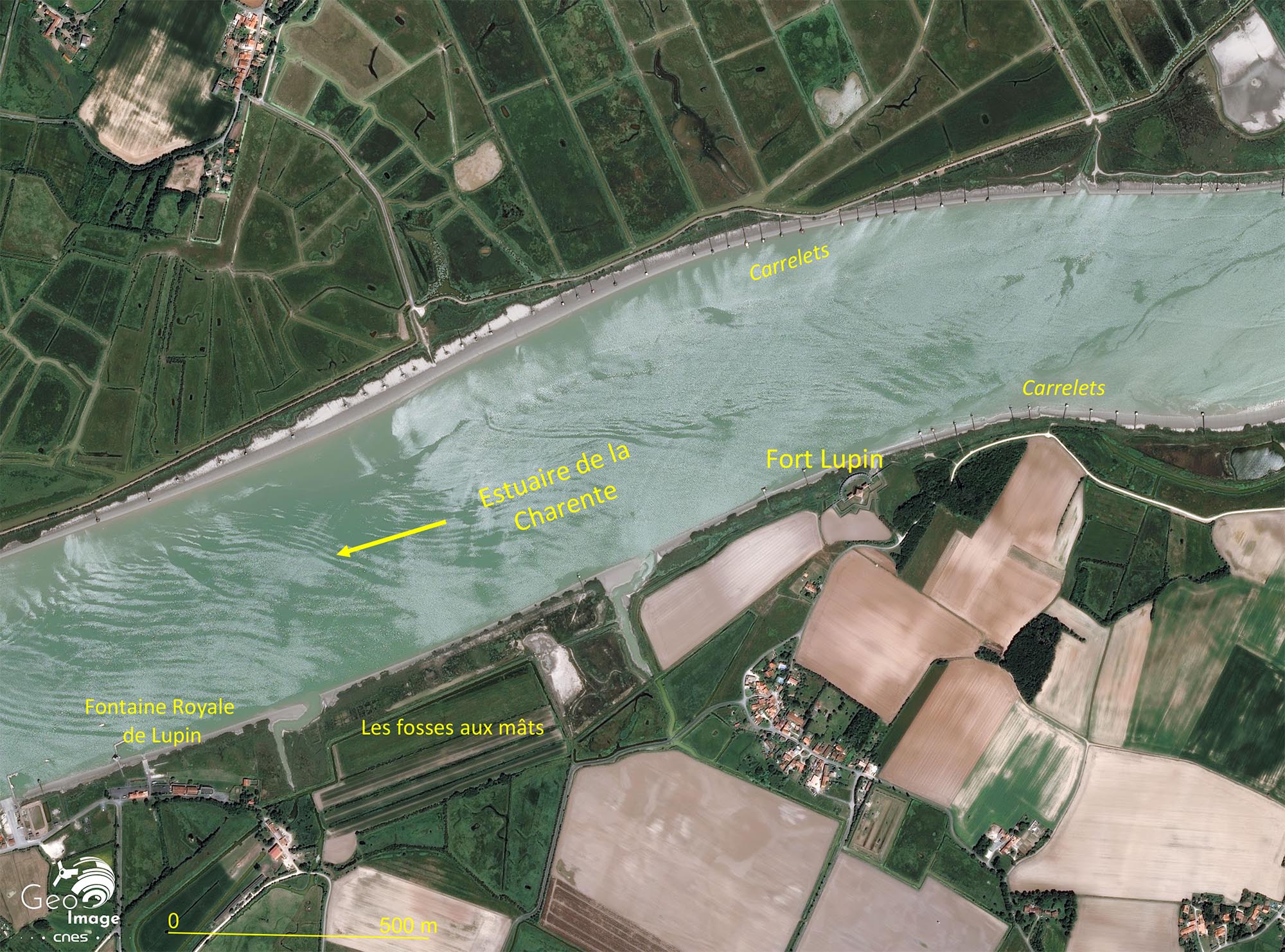 Sur cette image satellite, en aval de Rochefort sur la rive gauche de l’estuaire, on aperçoit l’une des fortifications, édifiée au XVIIe siècle selon les plans de Vauban : il s’agit de Fort Lupin. A cette époque, les navires sortant de l’arsenal en direction de l’Océan Atlantique, ne prennent le vent qu’à 3 kilomètres de l’embouchure de la Charente. Il faut donc que les hommes tirent les navires jusqu’à Saint-Nazaire-sur-Charente.
