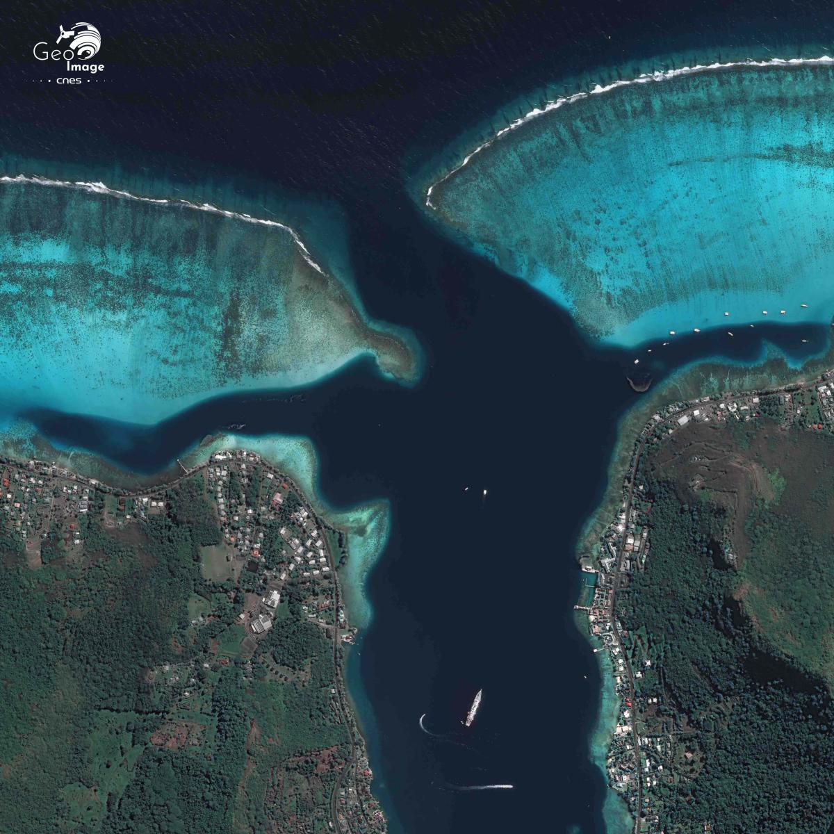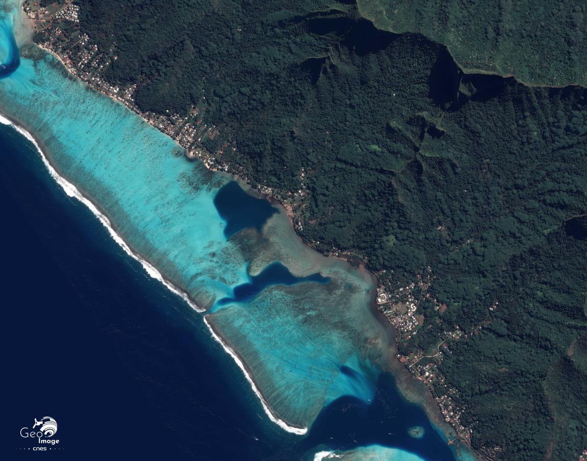 Cette image de l'île de Moʻoreʻa, au nord-ouest de Tahiti, a été prise par le satellite Sentinel-2B le 21 juin 2021. Il s’agit d’une image en couleurs naturelles de résolution native à 10m.