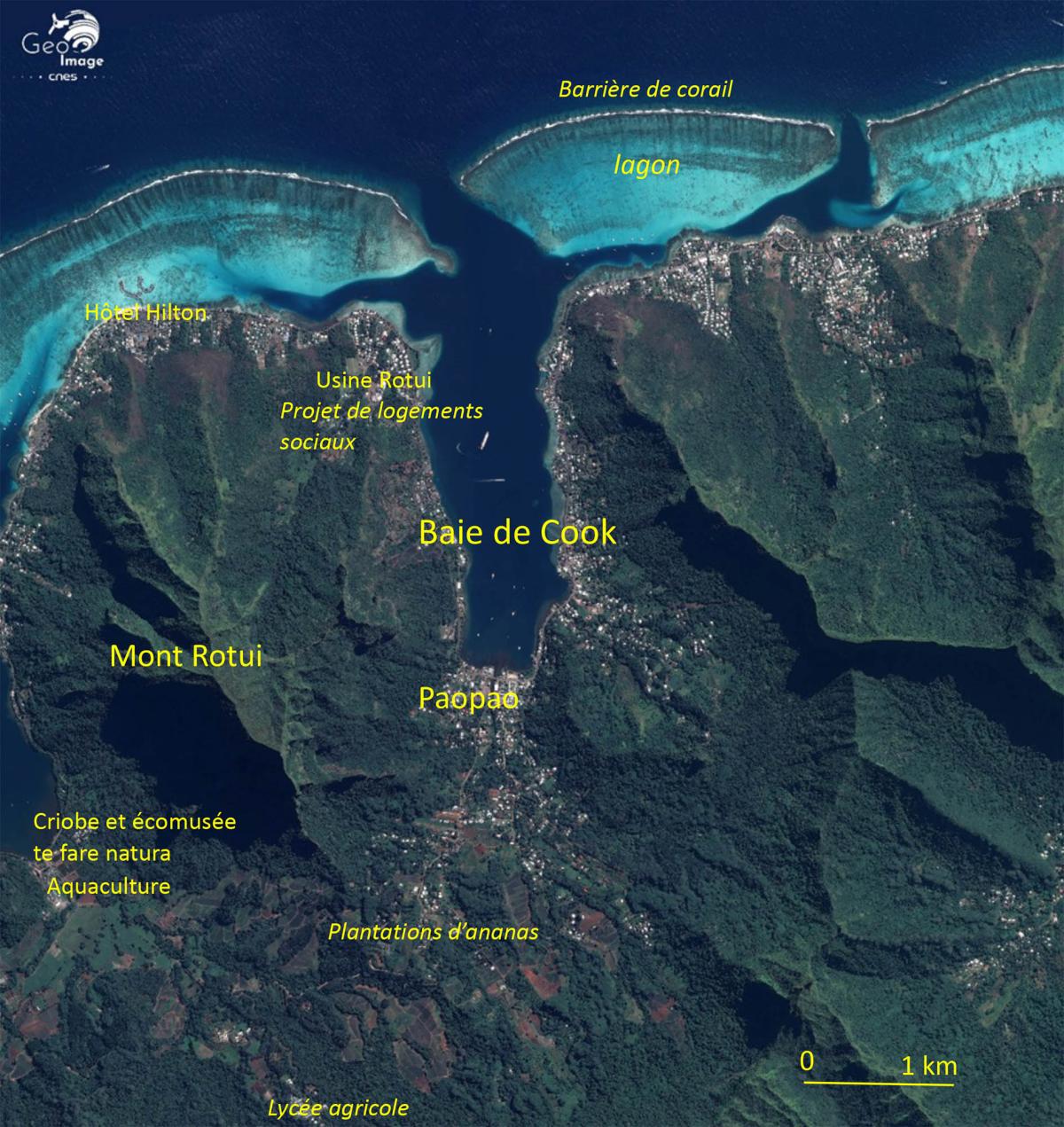 La notion de desakota, littéralement « ville-village », proposée par Terry G. McGee en 1991, désigne des formes de peuplement observées initialement en Asie, qui présentent une mixité des activités agricoles et non-agricoles dans des espaces densément peuplés, où la mobilité des populations est localement importante. Développée avant tout pour l’Indonésie, la desakota correspond aussi à des formes d’habitat et de vie d’autres lieux. A ce titre, Mo’orea, et notamment son littoral nord visible ici, peuvent être lus au prisme de cette notion. En effet, Mc Gee définit cinq critères pour identifier les desakotas :