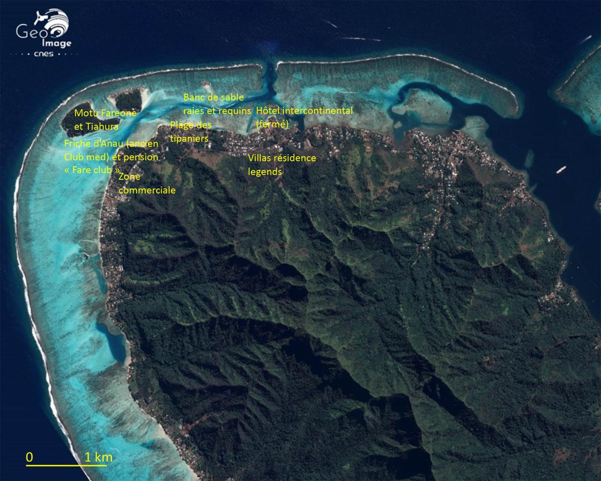 De nombreuses structures. D’autres aménagements et équipements à vocation touristique marquent l’espace : le golf de Tema’e situé au nord-ouest, dont l’emprise est visible sur l’image satellite, mais également de nombreuses implantations de micro, petites et moyennes entreprises à vocation touristique : restaurants, magasins de souvenirs ou de productions locales, bijouteries, tatoueurs, prestataires d’activités lagonaires (plongée sous-marine, location de bateaux, jet-skis, canoë, sorties pirogue avec nourrissage des raies pastenagues, sorties baleines) ou terrestres (centre culturel « tiki village », quad, acrobranche, équitation…).