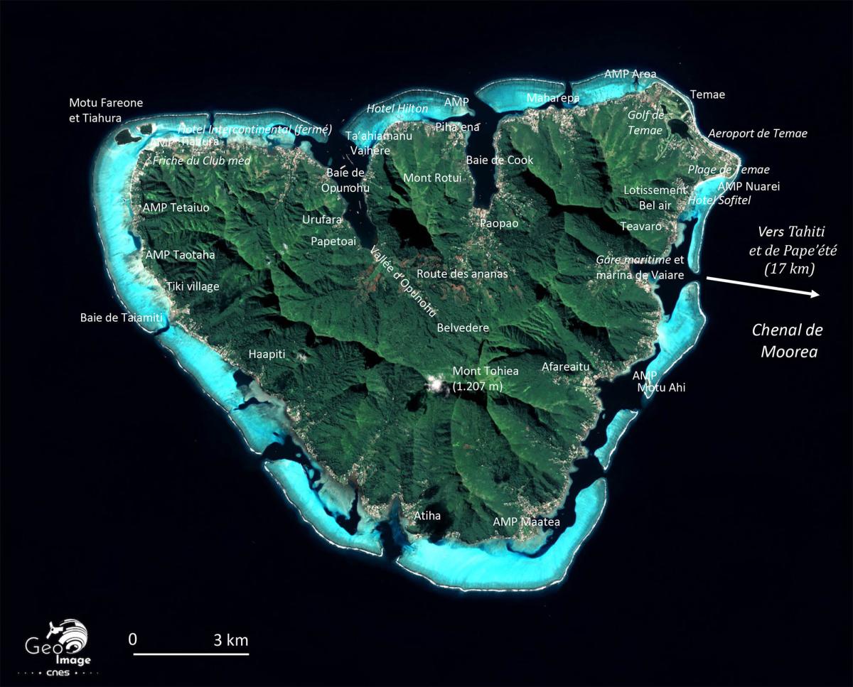 La commune-îles de Mo’orea-Mai’ao, qui regroupe les îles de Mo’orea et de Mai’ao, distante de 75 km et non visible sur l’image, est peuplée de près de 18 000 habitants, ce qui en fait la 4ème commune la plus peuplée de Polynésie française. Elle présente une densité d’un peu plus de 130 hab./km2. Sa population croît à un rythme modéré : + 0,8% par an entre 2012 et 2017. Elle est composée de six communes associées, implantées, exception faite de Mai’ao, le long d’une route de ceinture de 62 km de long : Afareaitu (environ 3.700 hab.), Teavaro (environ 2.500 hab.) Paopao (environ 4.600 hab.), Papetoai (environ 2.300 hab.), Haapiti (environ 4.250 hab.).