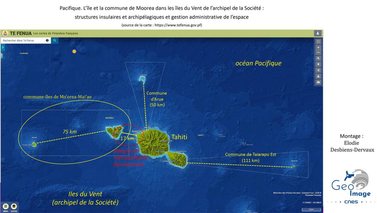 La Polynésie française comme l’archipel de la société, et au sein de celui-ci les îles du Vent, sont marqués par la macrocéphalie papeetienne et un modèle centre – périphérie très prégnant. Mo’orea est bien connectée à Tahiti, l’île principale, qui dispose d’un aéroport international, et avec laquelle elle entretient des liens quotidiens rendus possibles par des rotations maritimes multiples et régulières entre la gare maritime de Vaiare, à l’est de l’île, et celle de Pape’ete. Elle est ainsi devenue un espace périphérique de Tahiti et de l’aire urbaine de Pape’ete. « Île satellite », elle connait des dynamiques d’intégration à différentes échelles, du local au mondial. Cette intégration croissante peut se lire dans l’espace dévoilé par l’image satellite. Elle vise à répondre – temporairement ? – à une problématique de saturation de l’espace dans la zone urbaine de Pape’ete. Mo’orea est ainsi en voie d’annexion fonctionnelle au pôle dominant que constitue la capitale de la Polynésie française.