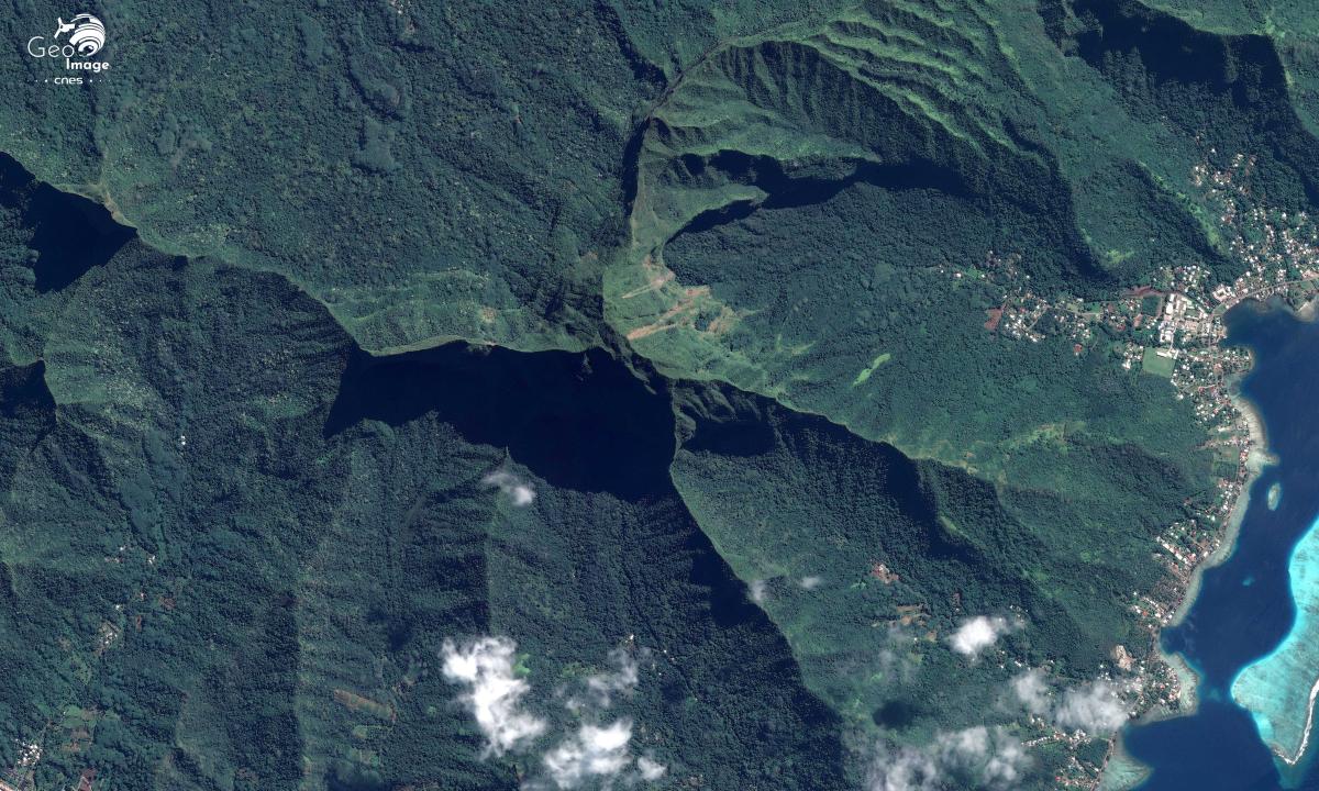 Couvrant le massif du Mont Tohiea, qui culmine à 1207 m d’altitude, et la retombée sur Afareaitu, cette image témoigne de l’étroitesse des crêtes sommitales, de l’étagement de la végétation et de l’importance des dynamiques d’érosion. L’organisation des reliefs détermine clairement la mise en valeur et l’occupation de l’espace. Afareaitu apparait comme une cellule polarisée sur le littoral mais dont le terroir communal est composé de différents finages naturels et agricoles, dessinant ainsi un espace-mosaïque d’échelle locale. Il est organisé par des gradients bien individualisés de mises en valeur.