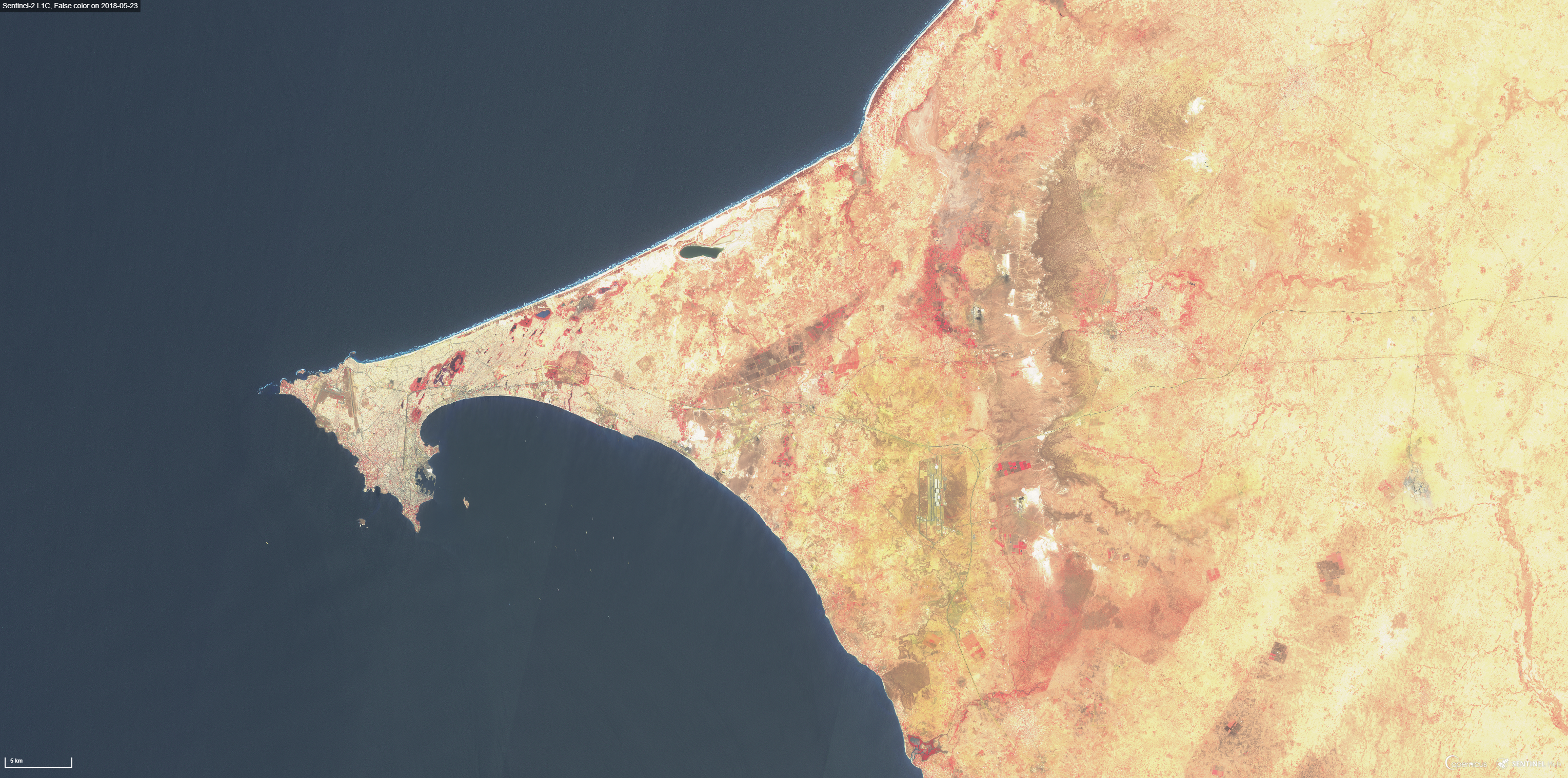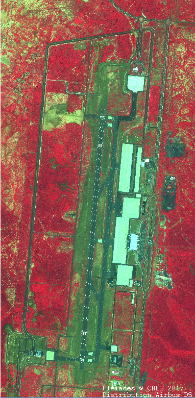 Les zones clôturées entourant l’aéroport correspondent à une savane herbacée arbustive en plein activité chlorophyllienne. Par contre autour des pistes et structures aéroportuaires la végétation est sèche (drainage, traitements herbicides?). Les pistes apparaissent en vert très sombre et les bâtiments et tarmac en béton en blanc. A la date de prise de vue l’aéroport n’est pas encore en activité et donc il n’y a aucun avion stationné.
