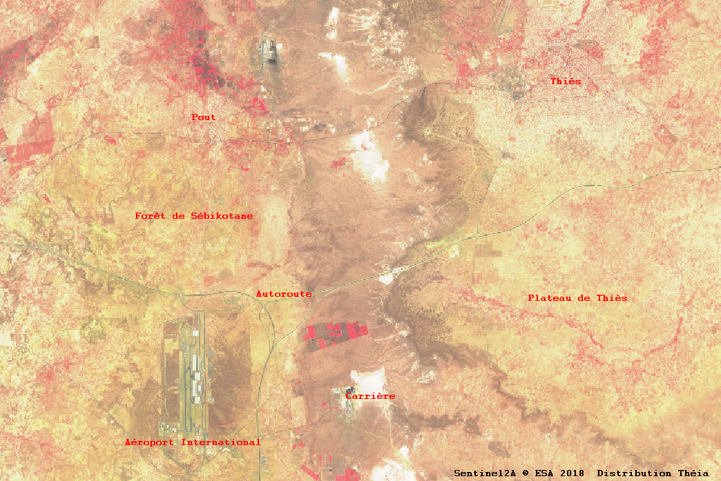 L’extrait est plus précisément localisé sur la partie fortement fracturée (failles normales subméridiennes liées à l’ouverture atlantique) du horst de Diass (village au sud immédiat de l’aéroport), en limite ouest du plateau sédimentaire de bancs surtout calcaires et grés argileux de Thiès dont on distingue très nettement la falaise indentée soulignée en marron-rouge sur l’image, falaise accentuée par la présence d’une faille.