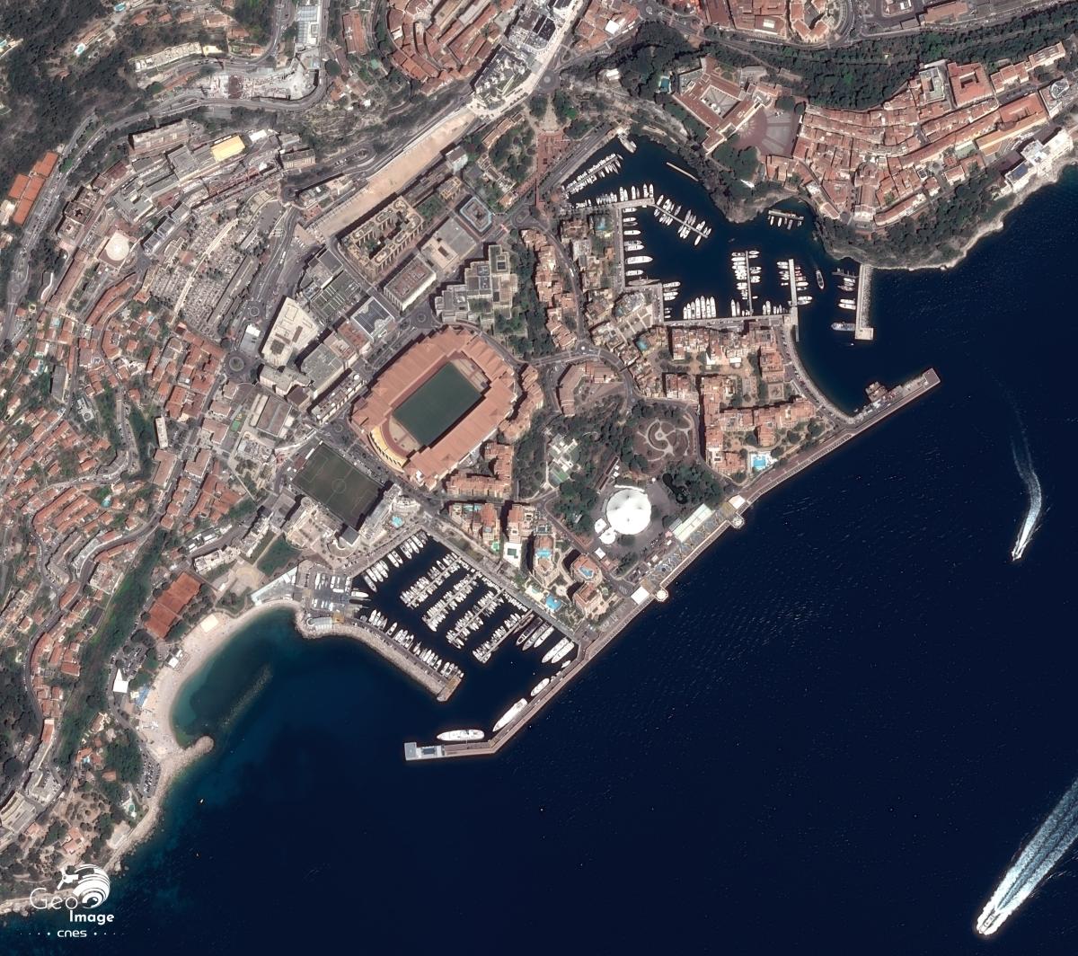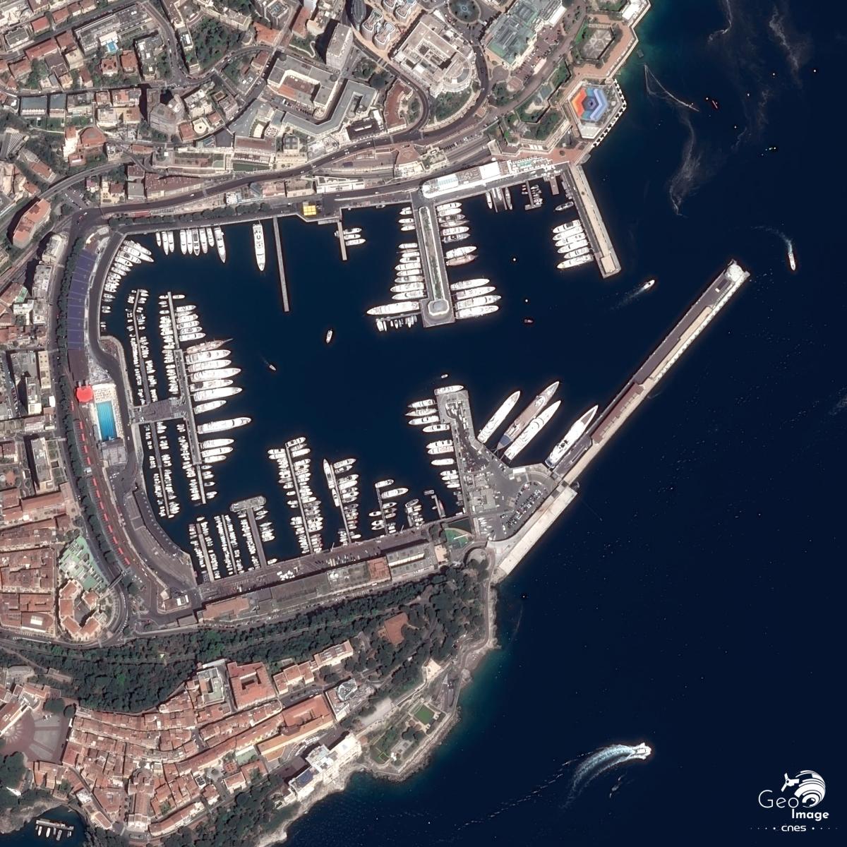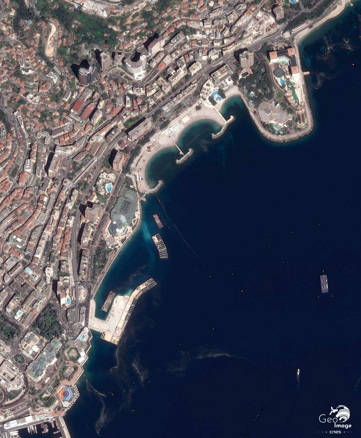 Nestled between the promontories of Monte-Carlo to the north and the Rocher of Monaco to the south, Port Hercules is a welcome maritime shelter on these steep coasts. A simple haven for centuries, the southern position was fortified by the Genoese on the site of the current palace (cut off in the image to the east of the square) and a tower to the west. In between is the first urban core on the Rocher. Its church to the south, erected as a cathedral in 1887, was rebuilt in the neo-byzantine style in 1910. On the south-eastern shore, the oceanographic museum was built in the 19th century directly above the cliff.