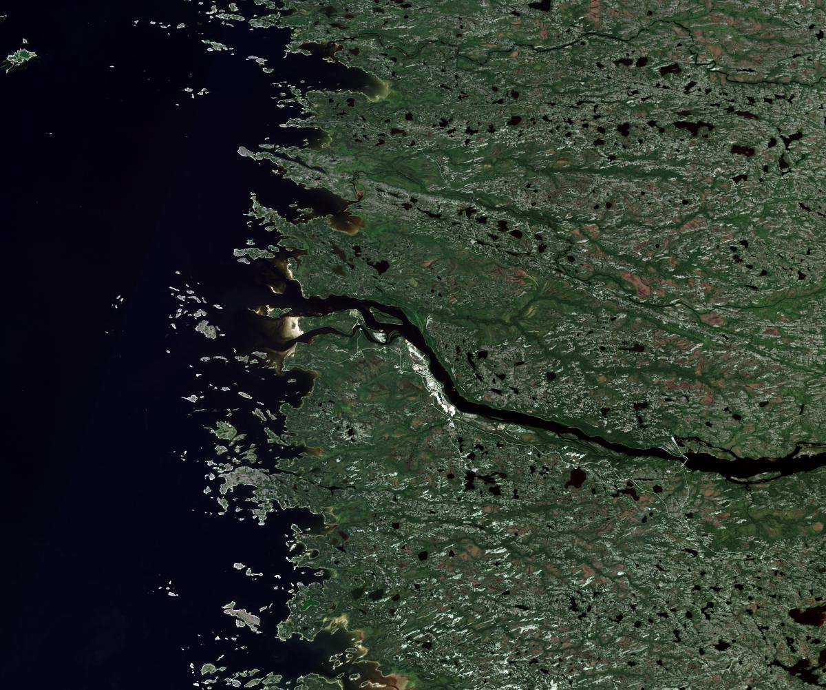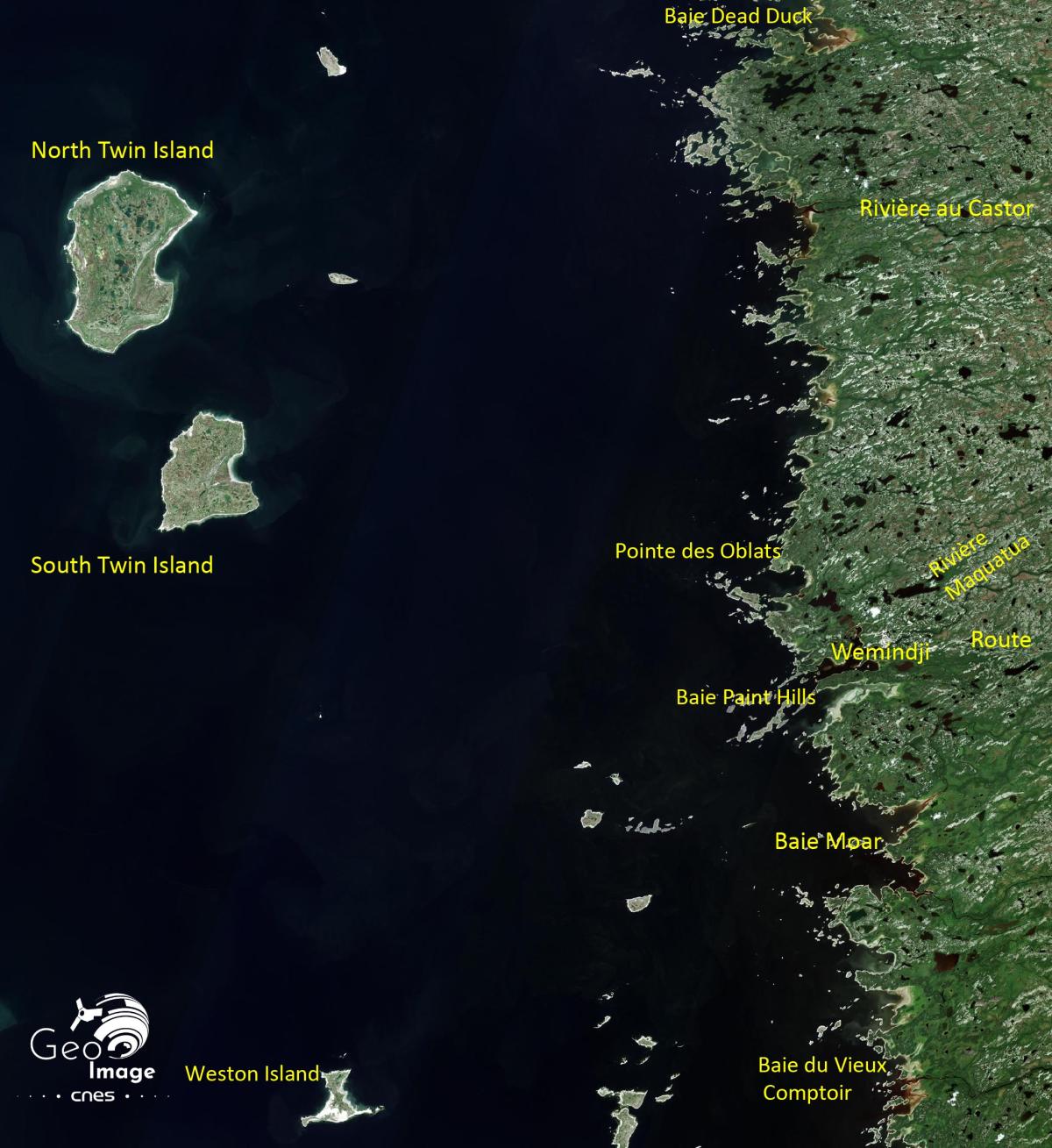 Cette image qui couvre 120 km Nord/Sud couvre la partie orientale du littoral de la Baie James, avec la présence en particulier des North et South Twin Islands. Du fait des basses altitudes, de la topographie, d’une structure de socle, des héritages du modelé glaciaire, de la faiblesse des marées et de la prise en glace des eaux une partie de l’année, la côte présente une structure particulièrement découpée (baies, criques, caps et îles). Trois rivières majeures, drainant le plateau intérieur lacustre, viennent se jeter dans la Baie James comme la Rivière au Castor ou la Rère du Vieux-Comptoir. Le seul îlot d’habitat repérable sur l’image par deux points blancs correspond à Wemindji, une municipalité de village Cri qui appartient au territoire d’Eeyou Istchee.