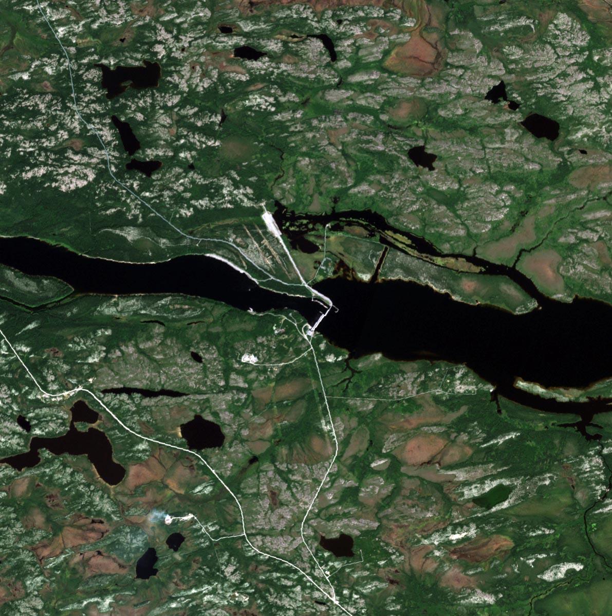 A l’ouest de l’image se distingue la localité de Radisson. Construite ex-nihilo lors de la première phase des travaux afin de loger les milliers d’ouvriers et cadres nécessaires, c’est aujourd’hui un petit pôle de seulement 350 personnes qui sert de base-vie à toute la région du fait de la très large automatisation des tâches, de l’absence d’une présence permanente et de la rotation régulière des équipes par avion dans un milieu contraignant et isolé.