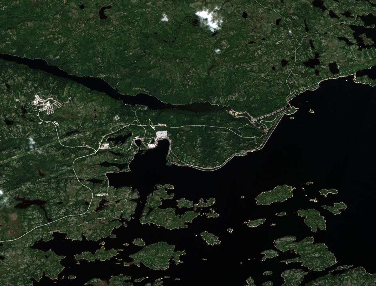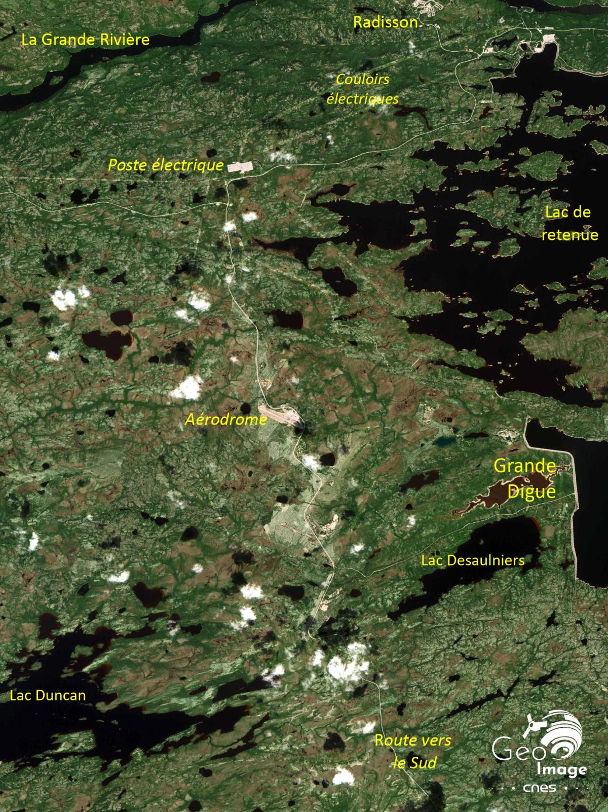 Nous sommes ici au sud-ouest du dispositif principal, bien visible avec Radisson dans l’angle de l’image. On aperçoit particulièrement bien la grande digue de plus de 9 km de long qui ferme ici un seuil topographique afin d’élever le niveau des eaux stockées. Dans cette marge, l’occupation humaine demeure ponctuelle, malgré les grandes opérations d’aménagement portées par ce gigantesque projet.