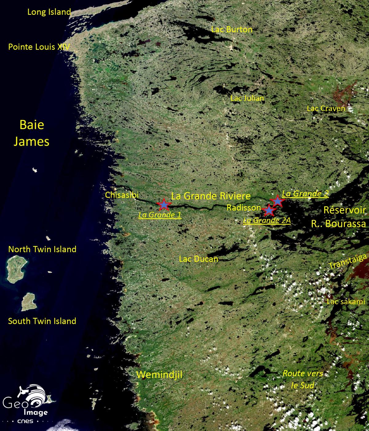 Comme le montre l’image, trois centrales hydroélectriques sont visibles sur l’image. A l’amont, La Grande 1 est une centrale au fil de l’eau. A l’aval, les centrales de la Grande 2-A et Robert-Bourassa sont deux centrales souterraines cumulant 22 turbines et exploitant deux chutes d’eau de 136 m de hauteur. Elles sont alimentées par un immense réservoir qui porte le nom de l’ancien Première ministre du Québec et « Père de la Baie James » Robert-Bourassa. Entrée en service en 1981, ce complexe est aujourd’hui par sa puissance installée au 6em rang mondial des grands barrages, derrière le Barrage des Trois Gorges (Chine), d’Itaipu (Brésil/Paraguay), de Xiluodu (Chine), de Guri (Venezuela) et de Tucurui (Brésil).