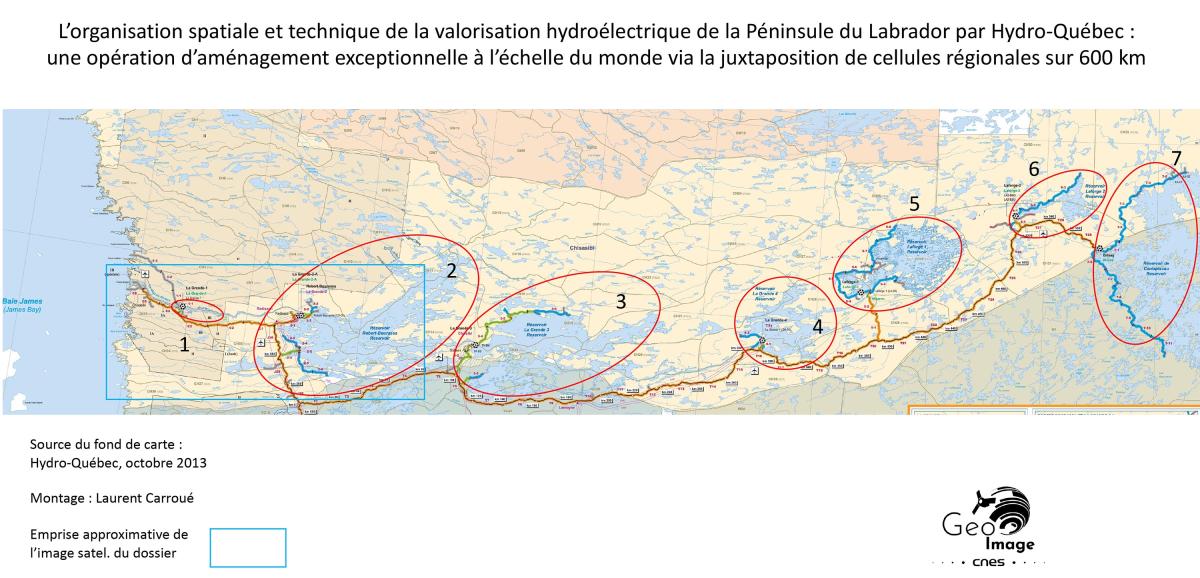 Au sud du réservoir Robert Bourassa apparait un axe routier Ouest/Est, c’est la fameuse route Transtaïga. Elle vient rappeler qu’à partir du complexe Robert Bourassa, Hydro-Québec s’est lancé vers l’est dans la création d’un système hydroélectrique exceptionnel à l’échelle mondiale qui se déploie sur plus de 600 km. On assiste à la création conjointe d’un système de barrages / réservoirs équipés de grandes centrales hydroélectriques : La Grande 3 à 100 km, La Grande 4 à 320 km, Laforge 1 à 400 km, Laforge 2 et, enfin, la centrale de Brisay avec le réservoir de Caniapiscau.