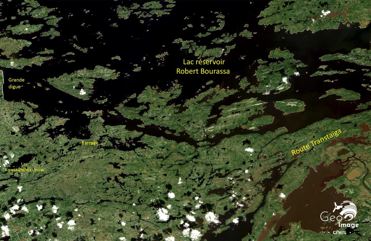 Au sud du réservoir Robert-Bourassa à partie du lac Yasinski se déploie un important axe routier bien visible sur l’image, c’est la Transtaïga. Longue de 700 km, elle s’enfonce vers l’est dans l’intérieur des terres jusqu’aux limites du Labrador pour desservir un chapelet de grands pôles énergétiques complémentaires au complexe La Grande/Robert-Bourassa. Chacun d’eux couple un barrage-réservoir à une centrale. A 130 km se trouve La Grande 3 avec un réservoir de 2 420 km2, à 320 km La Grande 4 avec un réservoir de 765 km2, à 490 km La Forge 1, à 520 km La Forge 2, à 600 km la centrale de Brisay et à 661 km le réservoir de Caniapiscau.