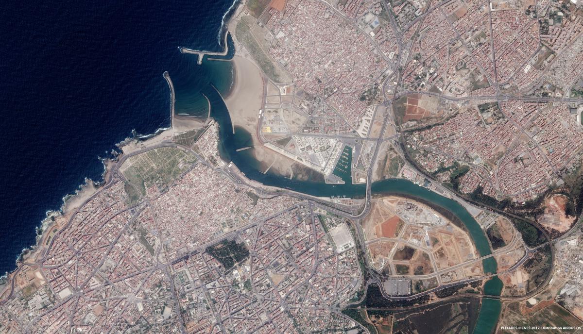 Image de l'aggolmération de Rabat-Salé au nord-ouest du Maroc prise par le satellite Pléiades le 20 avril 2017. Il s’agit d’une image en couleurs naturelles de résolution native à 0,70m.