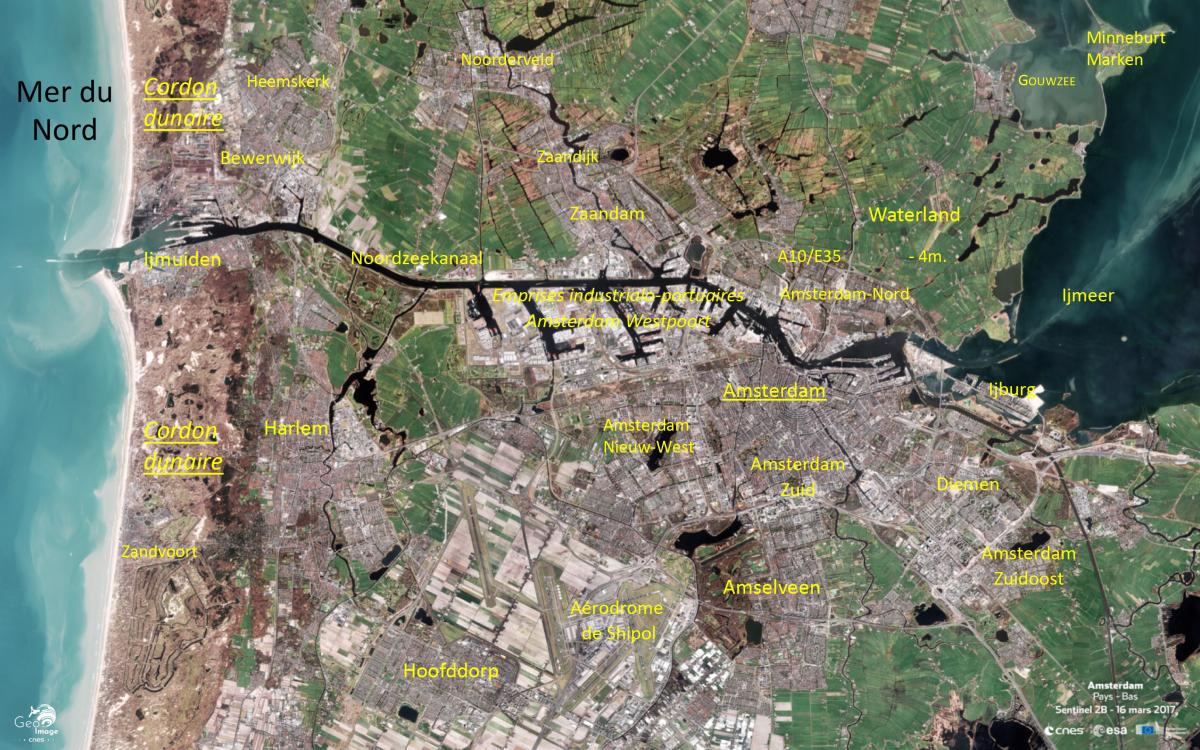 Sur l’image, un tiers à la moitié de l’espace est urbanisé. Le Grand Amsterdam se déploie largement à partir de son noyau historique vers le sud-est (Amsterdam Zuidost), le sud (Amstelveen et Aalsmeer), l’ouest et le nord où la tâche urbaine rejoint Zaanstad. Au centre-sud de l’image se trouve l’aéroport international de Schiphol, qui est un des grands hubs aériens d’Europe occidentale. A l’ouest se trouve Hoofddorp de forme carré (ouest de Schiphol) et surtout la vielle ville d’Harlem qui de développe au pied de l’espace dunaire.