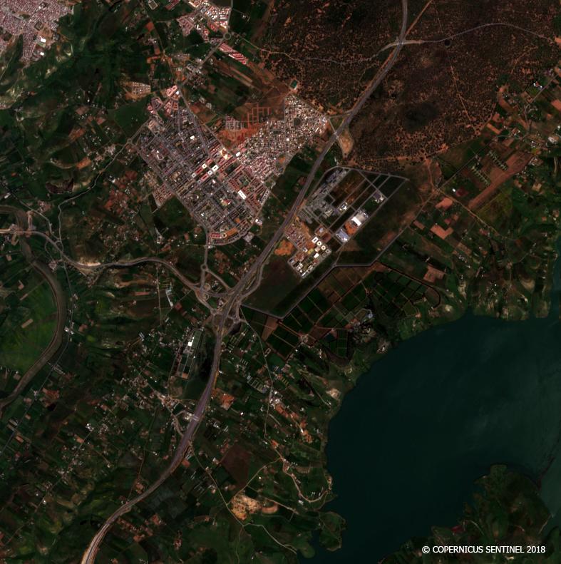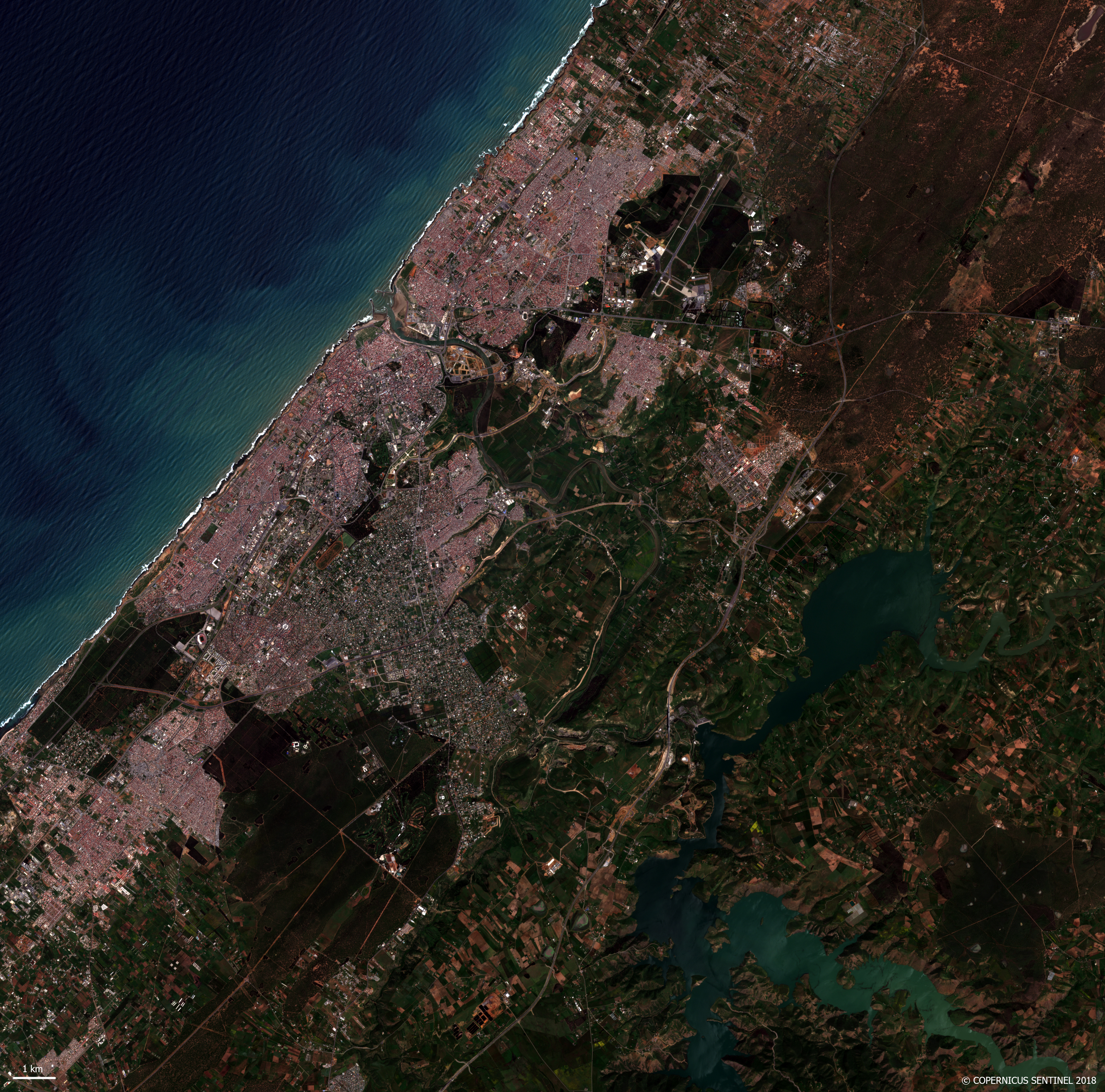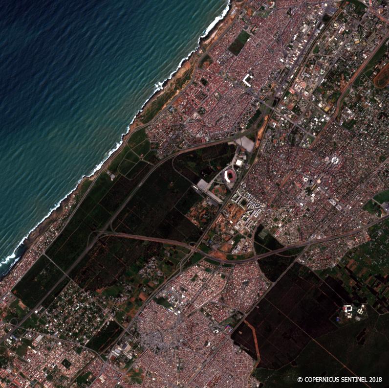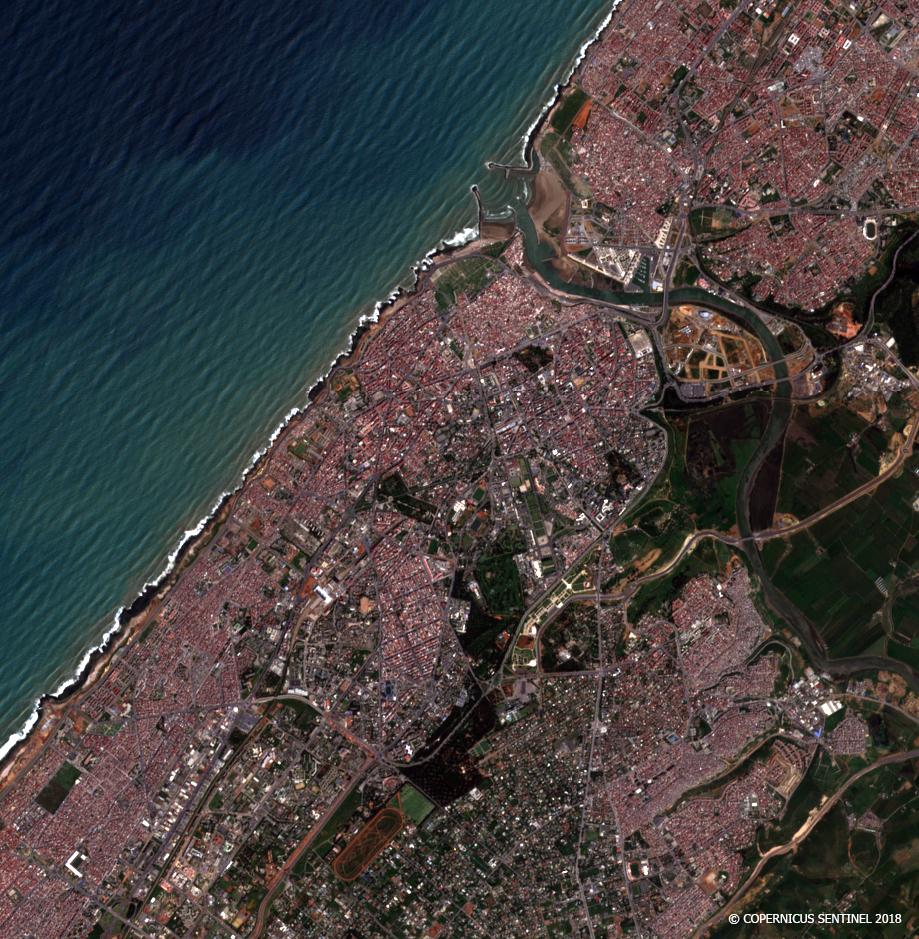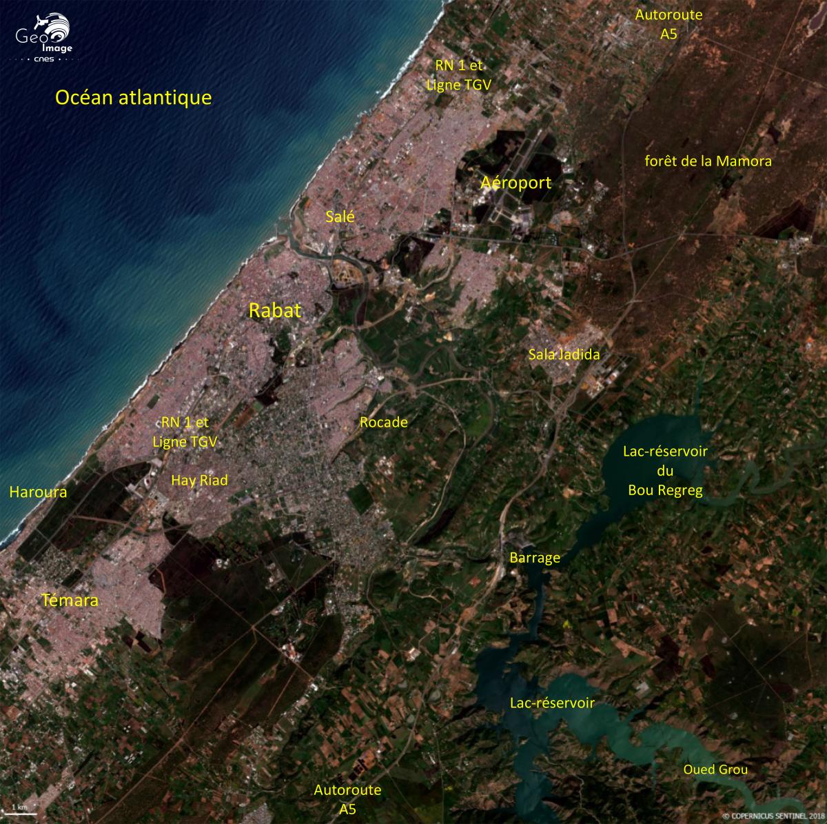 Cette image l’agglomération de Rabat-Salé, capitale du Maroc bâtie sur les rives du fleuve Bouregreg et de l'océan Atlantique, a été prise 17 avril 2018 par un satellite Sentinel-2. Il s’agit d’une image en couleurs naturelles de résolution native à 20m.