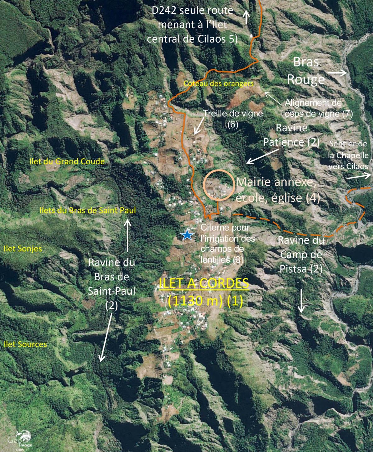 Il est possible de distinguer, accolées à la plupart des cases, des treilles (tâches en marron plus sombre (6)) sur lesquelles grimpent les vestiges du fameux cépage Isabelle (Vitis Labrusca) dont la culture fut interdite à la Réunion en 1975. La tradition du vignoble reste pourtant profondément ancrée dans le cirque, où il s’étend sur 13 hectares, une partie de la production se trouvant ici à Ilet à Cordes. Le climat est a priori peu favorable, c’est pourquoi les raisins sont récoltés en janvier-février avant même d’être vraiment mûrs par crainte des grosses pluies et des cyclones en février-mars, ce qui laisse présager a priori un vin de piètre qualité. Il fait néanmoins l’objet d’un travail minutieux : le ramassage des raisins est fait à la main.
