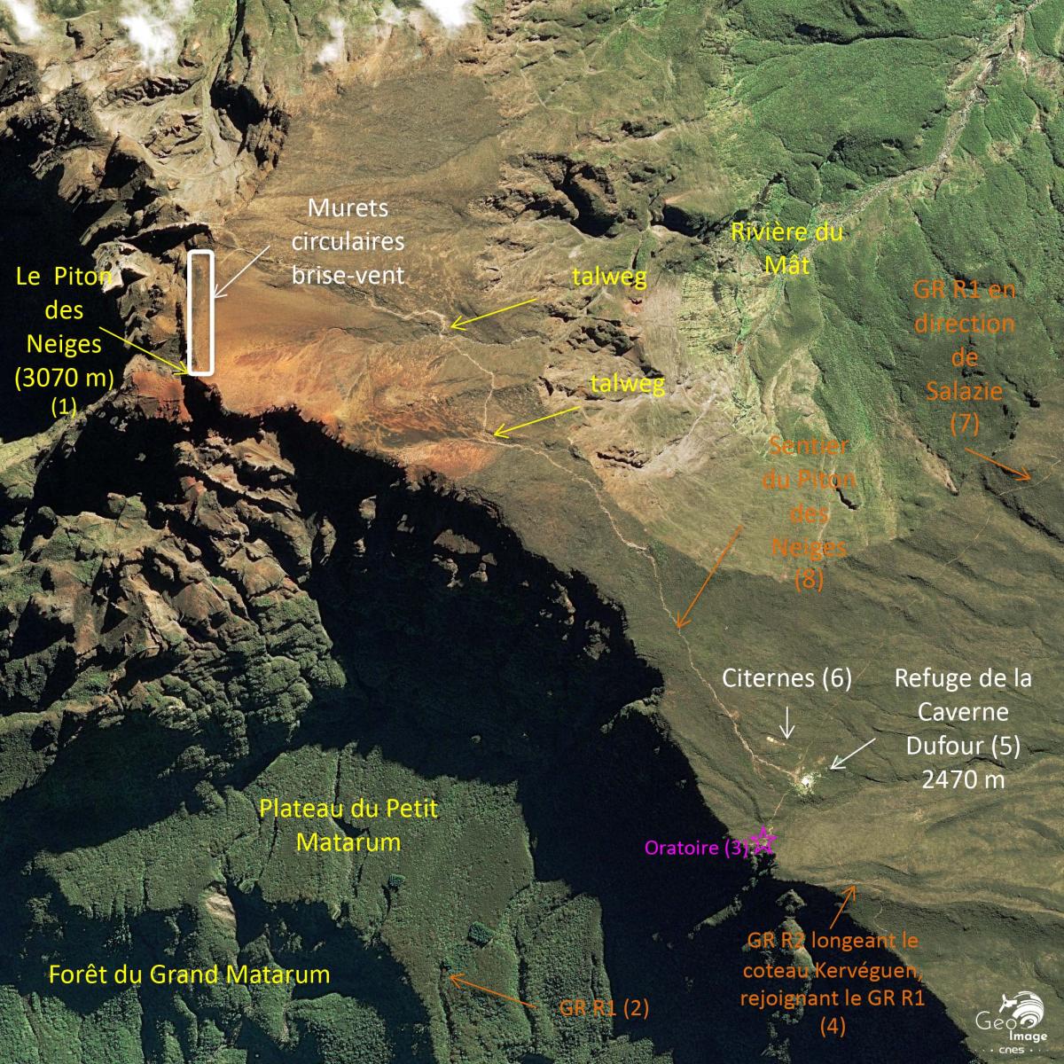 Son ascension réputée difficile - avec 1.700 m de dénivelé sur 7 km ! - débute (hors image) au Nord du village de Cilaos, au niveau du parking du « Bloc » situé à 1.380 m d’altitude. C’est l’endroit où étaient provisoirement attachés les fugitifs rattrapés par les chasseurs d’esclaves, l’instrument qui permettait de leur « bloquer » les mains et la tête ensemble se nommant ainsi. Il s’agit d’abord, en empruntant le GR R1 (2) de traverser la forêt du Grand Matarum au Sud, longer le Plateau du Petit Matarum, sur lequel on voit se détacher nettement les reboisements en cryptomérias du Japon, puis franchir le très vertical rempart Est qui se perd dans l’ombre de l’image (près de 437 m de dénivelé sur 450 m de distance environ, soit une pente de 95% !).