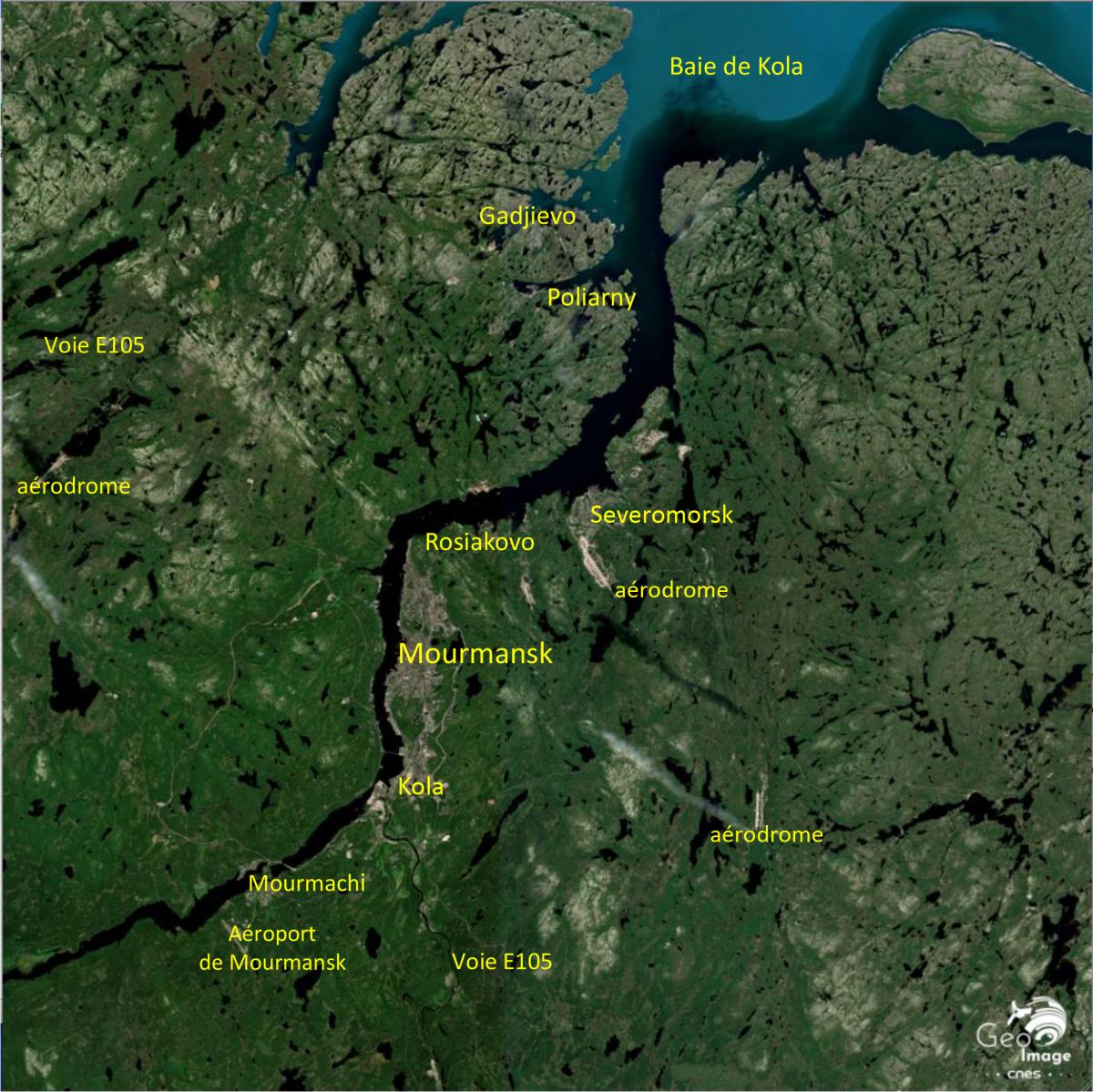 On y distingue en particulier très bien Mourmansk et son port et, plus en aval du fleuve Kola sur la vile droite, la ville de Severomorsk et son important aéroport militaire. Ce dernier est complété sur l’image par plusieurs autres aérodromes alors que l’aéroport civil qui dessert l’agglomération est tout au sud de l’image.