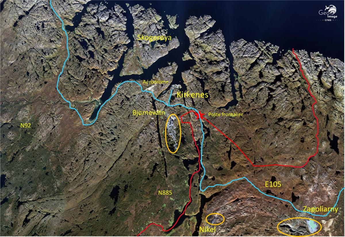 A l’est de la rivière qui sert de frontière entre la Norvège et la Russie, l’axe E105 dessert deux grands complexes miniers russes, celui de Nikel à l’ouest et, surtout, celui de Zapoliarny à l’est. Nous sommes ici entre 100 et 130 km à l’ouest de Mourmansk. Les deux mines et les deux complexes sont la propriété du géant russe Norilsk Nickel, un ancien gigantesque combinat soviétique privatisé en 1994 et regroupant les grands sites de Norilsk, de Petchenganickel, qui regroupe Zapoliarny et Nickel, et Severonickel/ Montchegorsk. Entre Zapoliarny et Nikel se trouve le site du forage Sg3, aujourd’hui à l’abandon.