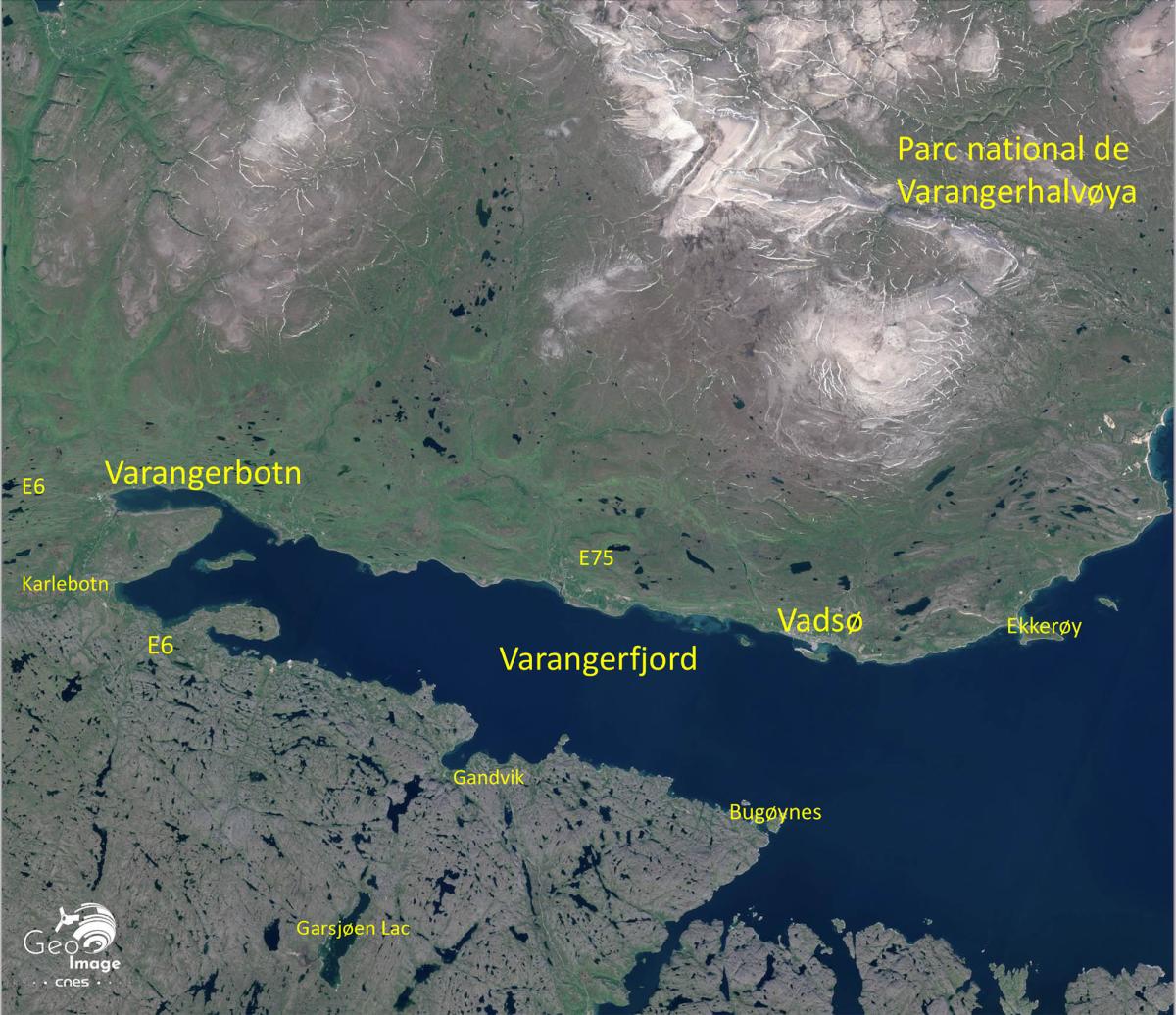 L’image couvre le Varangerfjord d’orientation est/ouest qui entre largement sur environ 100 km dans les terres à partir de la Mer de Barents. Il sépare deux systèmes topographiques, tectoniques et morphologiques bien différents. Au nord se déploie la péninsule de Varanger(halvøya) qui est constituée de montagnes bien blanches, aux formes arrondies mais assez élevées. En ce début juillet, elles portent encore un peu de neige ; la péninsule appartient en effet aux milieux et climats arctiques.