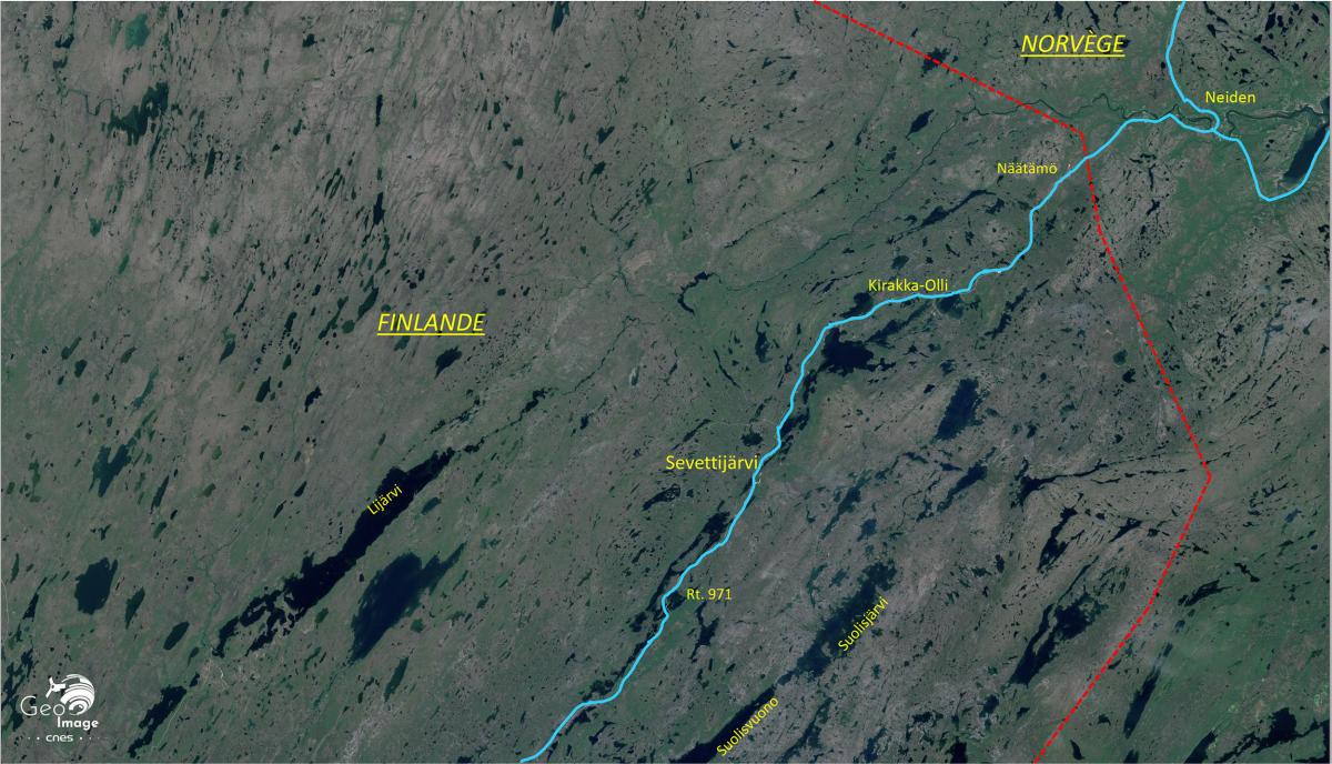 En particulier, la Pasvikelva - Paatsjoki en finlandais - est un petit fleuve côtier qui prend sa source à seulement 118 m. d’altitude bien au sud en Finlande dans le grand Lac Inari. Il coule ensuite plein nord sur 145 km pour se jeter sur l’image dans le Bøkfjorden, qui est une des branches de rive droite du puissant Varangerfjord. La Pasvikelva sert à fixer partiellement la frontière entre l’Empire russe et le Royaume de Norvège en 1826, la frontière entre la Norvège et la Finlande entre 1920 et 1944 puis à nouveau la frontière entre la Norvège et l’URSS/ Russie depuis 1944.