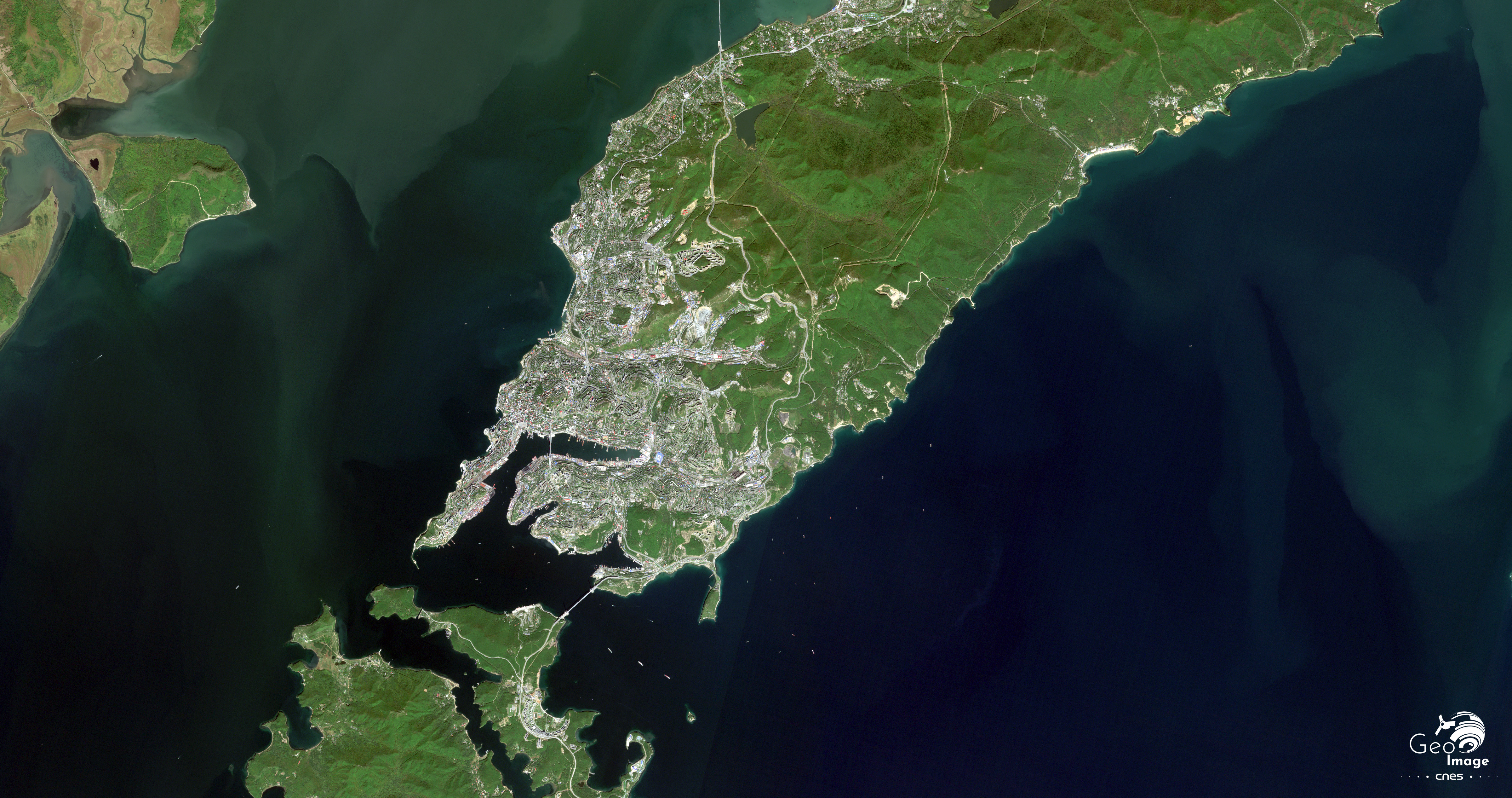 Cette image présente la ville de Vladivostok, qui se situe dans l’extrême sud-est de la Russie. Cette ville portuaire s'étend le long d'une baie bien abritée, le Zolotoï Rog (littéralement « Corne d’Or »). Elle occupe l'extrémité sud de la péninsule Mouraviov-Amourski, qui s’avance sur 30 km de long et 12 km de large dans le golfe de Pierre-le-Grand, en mer du Japon. La ville est bordée à l'ouest par la baie de l'Amour, à l'est par la baie de l'Oussouri et au sud par le Bosphore oriental, qui la sépare de l'île Rousski.