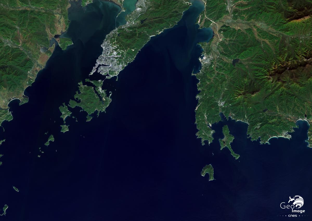 Cette image de Vladivostok, ville portuaire du Pacifique, a été prise le 2 octobre 2018 par le satellite Sentinel 2A. Il s’agit d’une image en couleurs naturelles de résolution native à 10m.