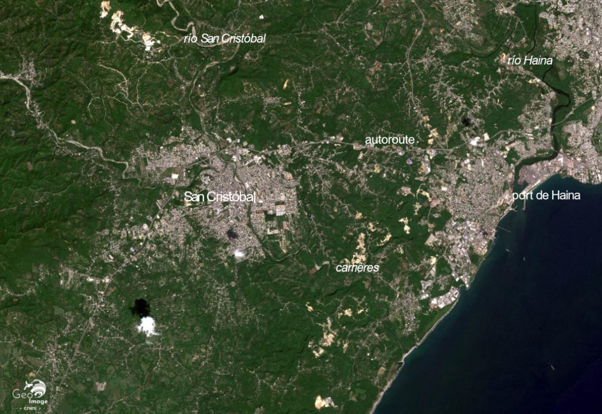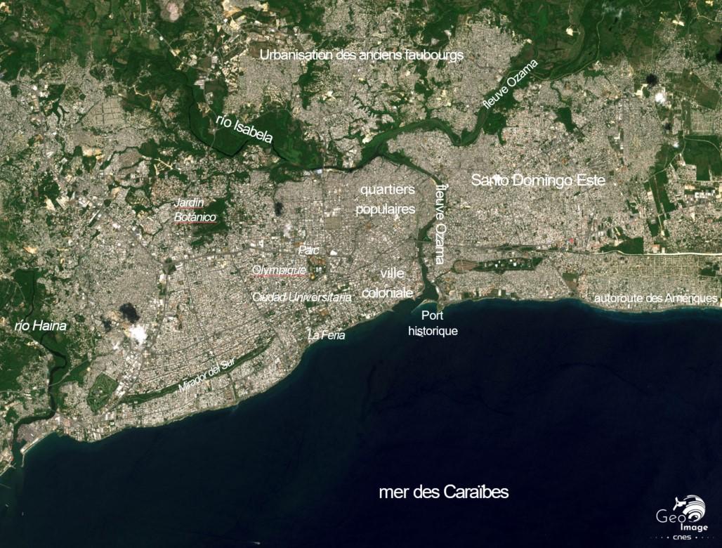 Sur l’image satellite, l’agglomération de Santo Domingo s’étend sur 60 kilomètres d’Est en Ouest le long de la côte caraïbe. La coupure de l’embouchure du fleuve Ozama est bien marquée au centre. Ici se situe le site originel de la ville coloniale, fondée en 1496 peu après la « Découverte » et la Conquête de l’île par Christophe Colomb. A l’ouest, se situe une indentation du littoral qui correspond à l’embouchure d’un autre fleuve, moins important, le río Haina. A l’est, le cap Caucedo s’avance dans la mer et sert de plate-forme naturelle à deux infrastructures notables, l’aéroport international « Las Américas » et le port « multimodal » de Caucedo.