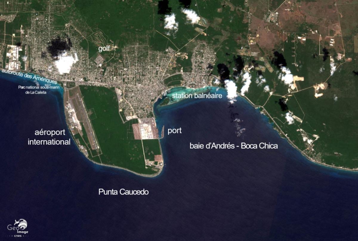 La baie d’Andrés - Boca Chica. Dans la partie Est de la Pointe de Caucedo, deux éléments distincts occupent la baie d’Andrés - Boca Chica, marquée par des couleurs bleutées : la station balnéaire de Boca Chica, très fréquentée par les citadins puisqu’elle est accessible en moins d’une heure de trajet automobile et deuxième élément, l’urbanisation d’Andrés qui, historiquement, s’est développée autour d’une usine sucrière fondée en 1916 et maintenant fermée.