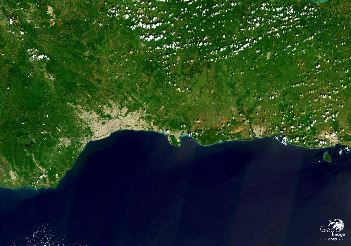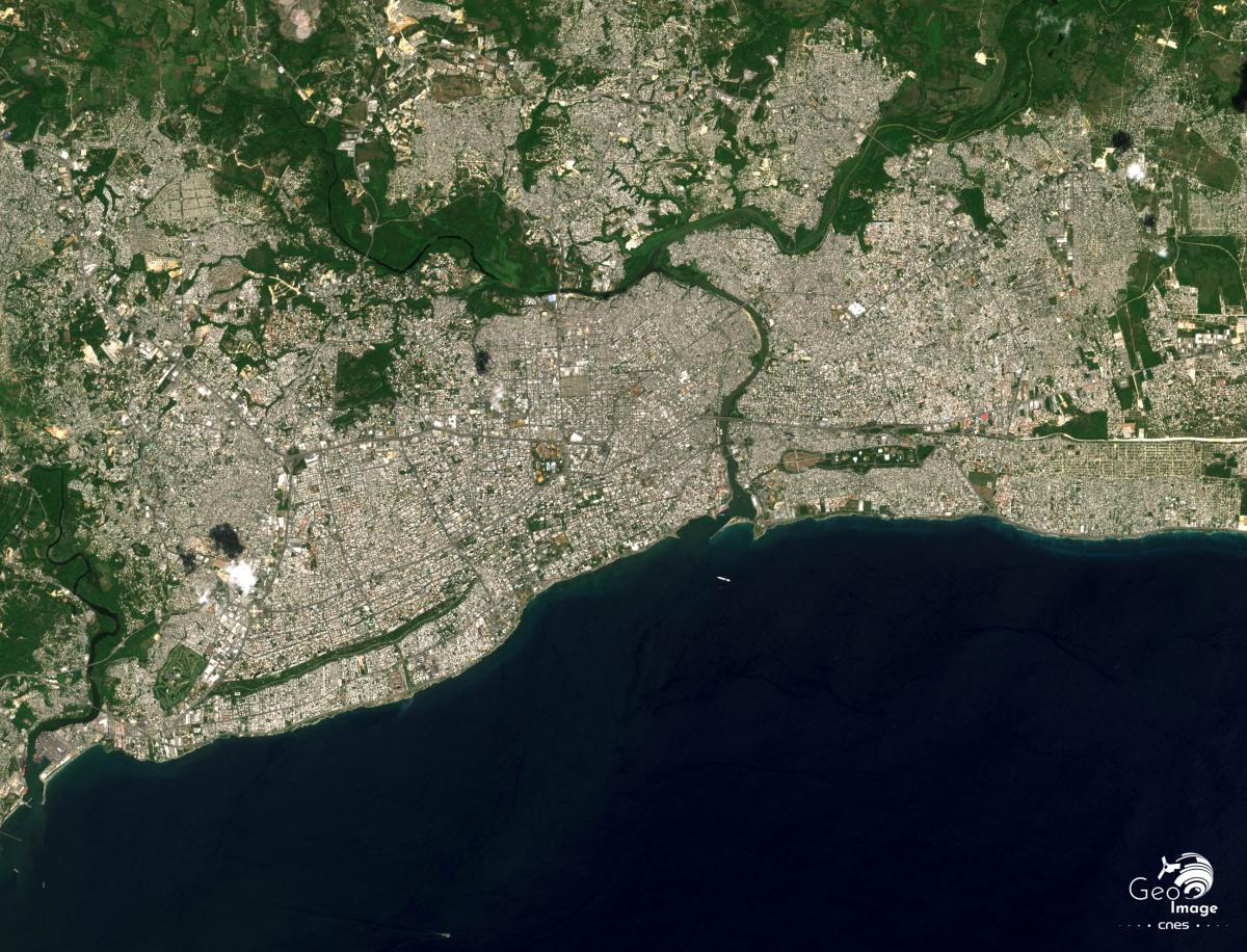 Santo Domingo - souvent dénommée Saint-Domingue en français - est la plus ancienne fondation urbaine des Européens en Amérique. Sa destinée est étroitement liée à celle de la colonie espagnole de Santo Domingo, puis de la République Dominicaine à partir de 1844. L’image satellite de cette agglomération bordant la mer des Caraïbes surprend par l’extension du bâti et l’importance des infrastructures (aéroport, ports...) dans un cadre néanmoins très vert – les images sont datées d’octobre 2019, vers la fin de la saison des pluies. Capitale d’une colonie longtemps stagnante, puis d’un petit pays périphérique, Santo Domingo a émergé dans les décennies récentes comme une métropole dynamique, avec une croissance rapide et problématique à certains égards. La population métropolitaine est estimée entre 3,5 et 4 millions d’habitants.