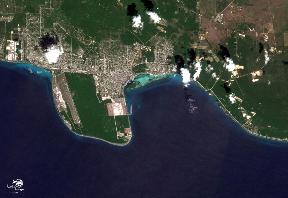 La pointe de Caucedo. A l’Est la métropole gagne des zones côtières demeurées nettement périphériques jusqu’à une date récente. Au centre de l’image la pointe de Caucedo (Punta Caucedo) s’avance nettement vers le Sud. Elle a la forme d’une plate-forme dissymétrique (en forme de dent). A l’ouest de l’image on observe des installations industrielles sous de petits nuages et un quadrillage de lotissements en voie de viabilisation (sous un gros nuage blanc). Ce sont les pointes avancées de l’urbanisation, qui rejoint donc les nouvelles infrastructures implantées à l’est, facilement accessibles grâce à « l’autoroute des Amériques », située immédiatement en bord de mer.