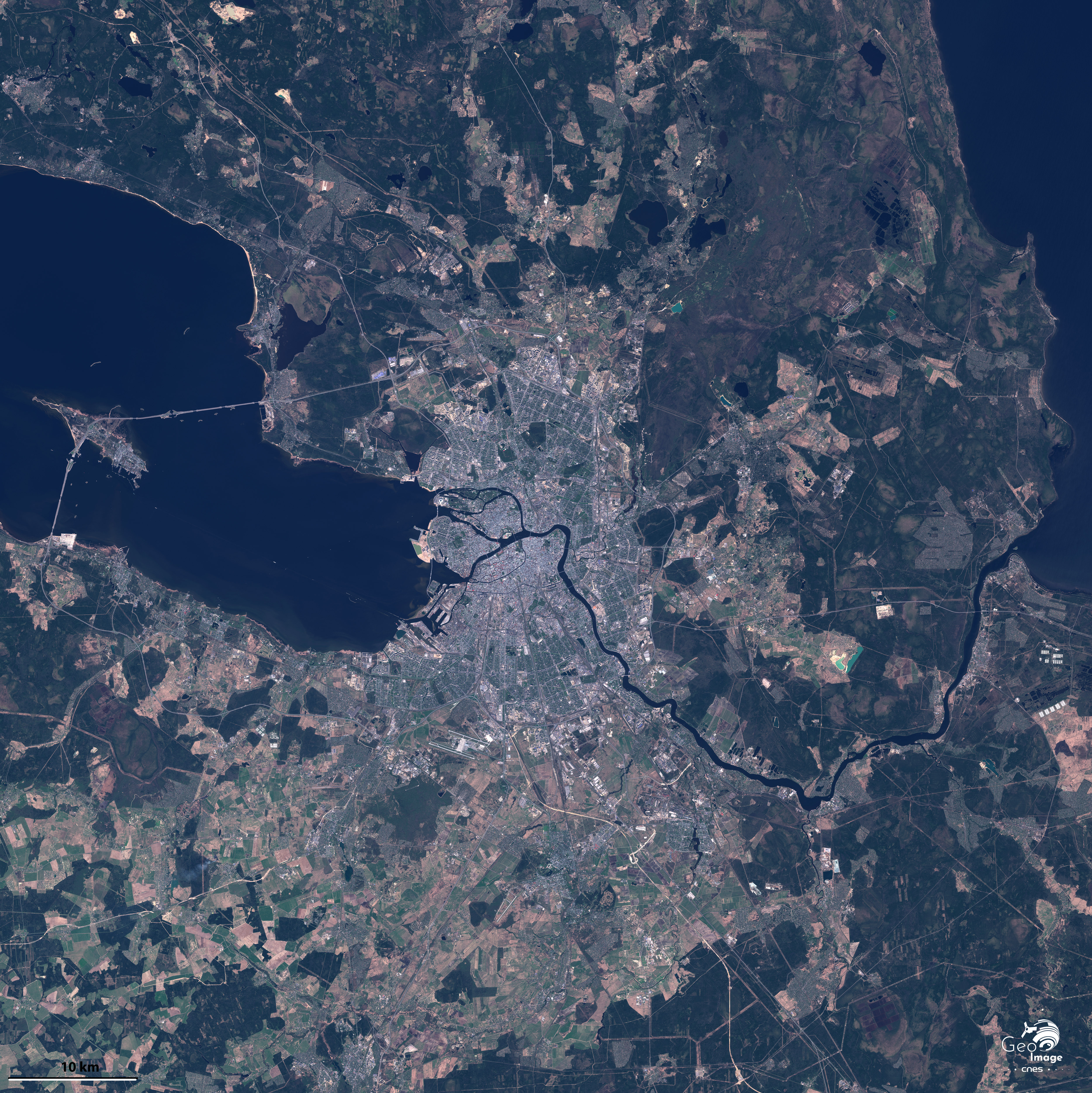 Image de la ville de Saint-Pétersbourg, réalisée par un satellite Sentinel-2, le 9 mai 2018. La résolution de cette image est de 10m.