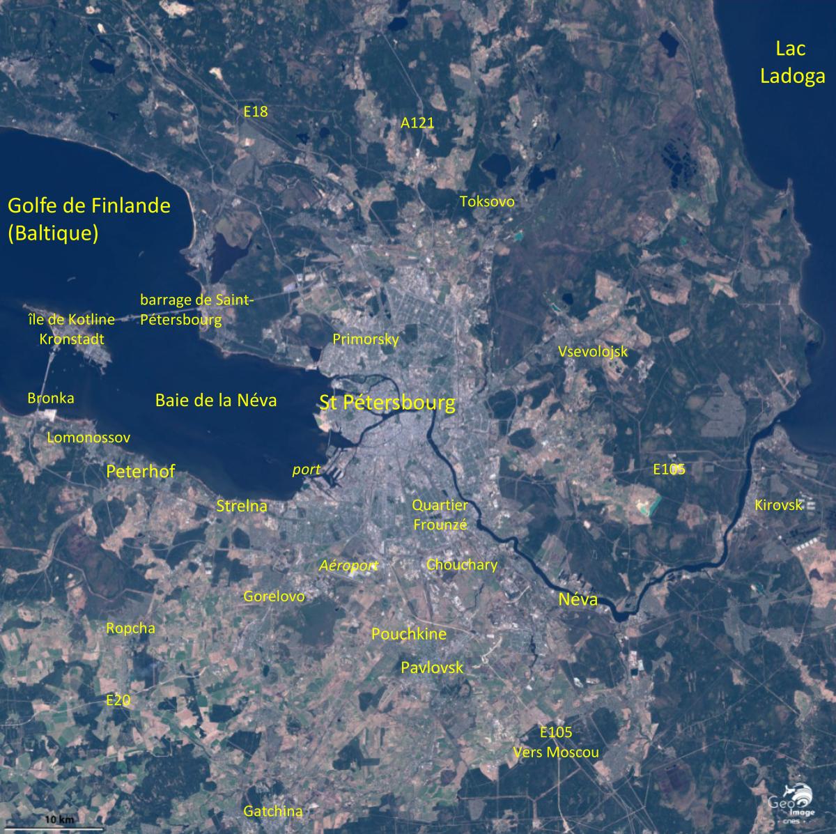 On voit bien sur l’image le barrage de Saint-Pétersbourg. Cette construction commencée en 1979 et relancée dans les années 2020 est achevée en 2011. Elle vise à protéger Saint-Pétersbourg des inondations en permettant aux eaux de la Neva de s’écouler sans encombre dans le golfe. La digue de 25 km de long et 8 mètres de hauteur comporte deux passes navigables visible sur l’image. Cette construction a été très fortement contestée à cause des risques environnementaux sur la stagnation de l’eau et son appauvrissement.