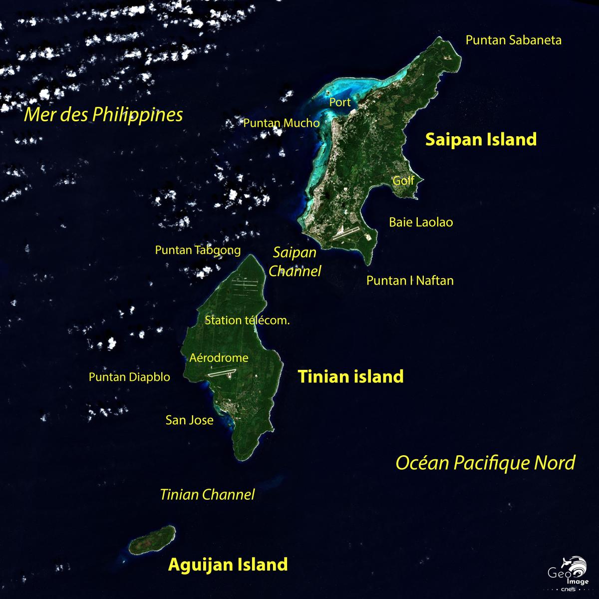 Cette image de trois des îles Mariannes du Nord (Saipan, Tinian et Aguijan), territoire des États-Unis le Pacifique, a été prise par un satellite Sentinel-2 le 5 et le 12 octobre 2019. Il s’agit d’une image en couleurs naturelles de résolution native à 10m.