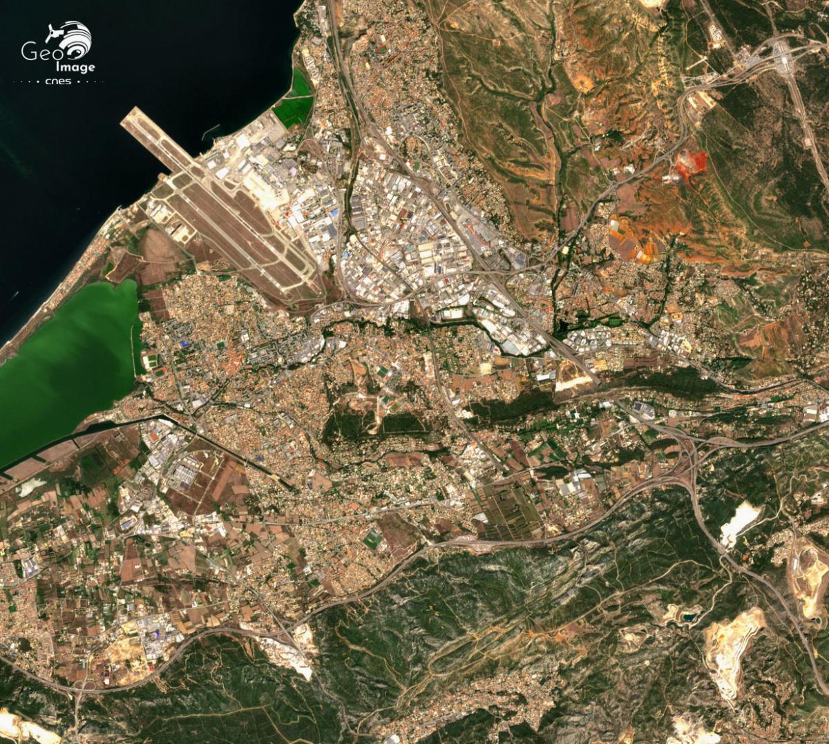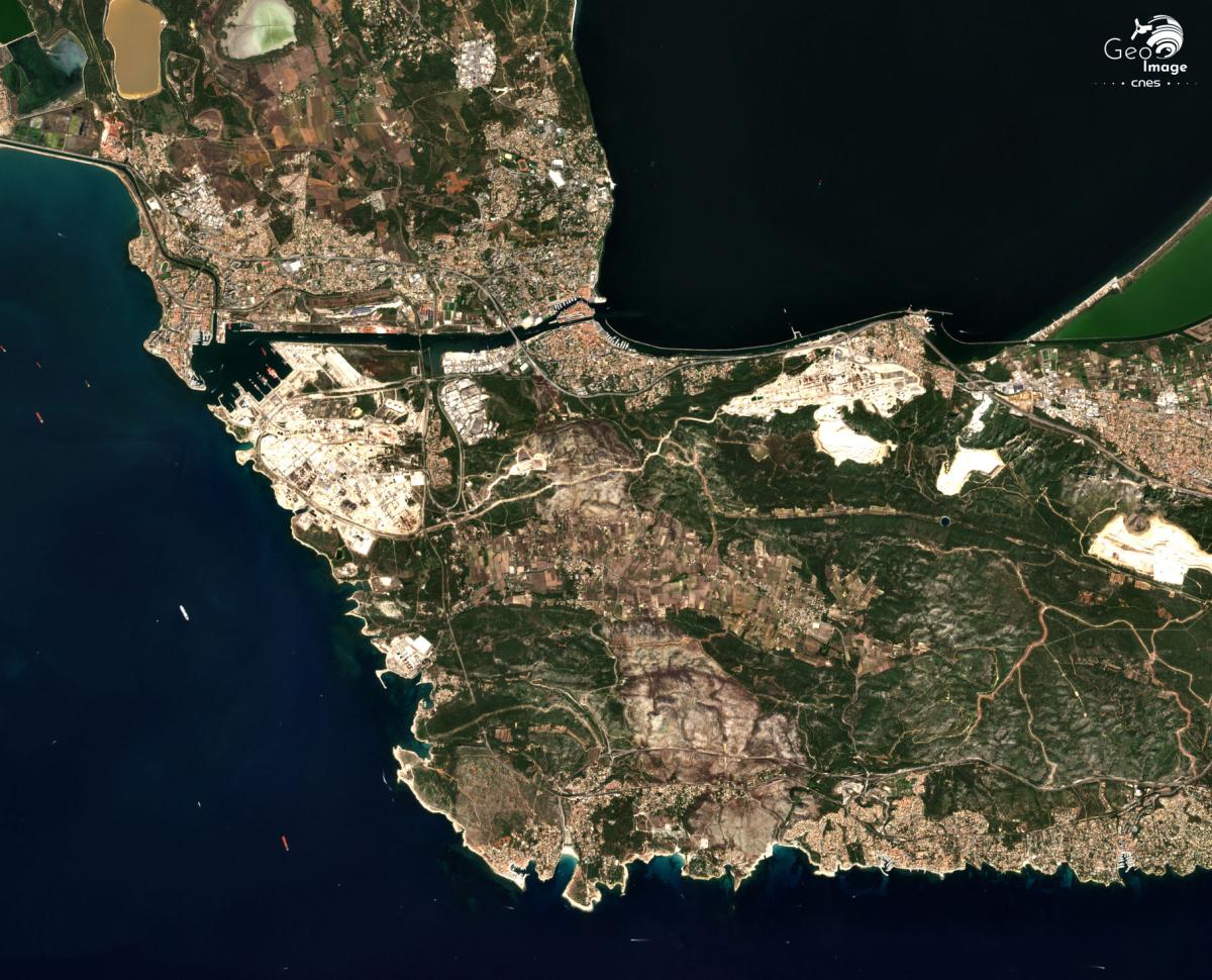 Cette image dé l'étang de Berre, situé à l'ouest de Marseille, a été prise par le satellite Sentinel-2A le 10 mars 2021. Il s’agit d’une image en couleurs naturelles de résolution native à 10m.