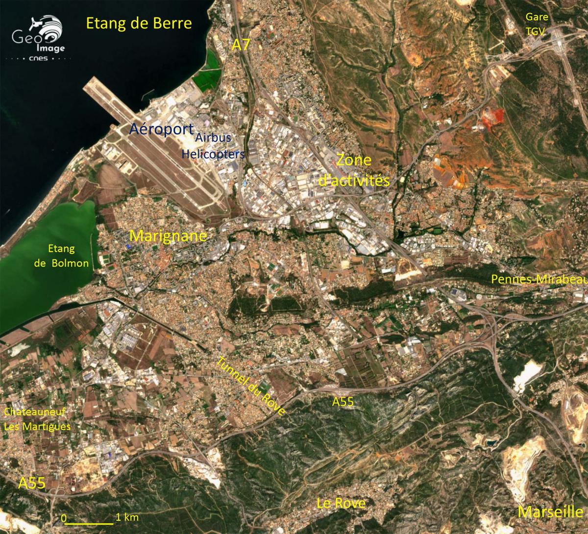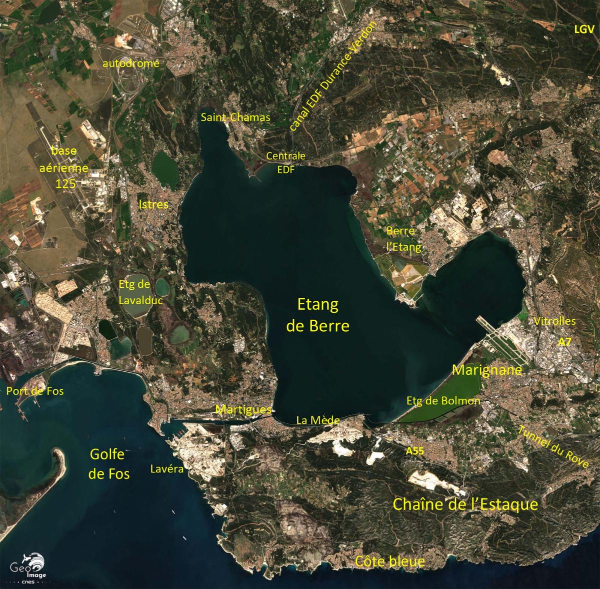 L’étang de Berre est situé entre l’agglomération de Marseille à l’Est, le complexe industrialo-portuaire de Fos-sur-Mer à l’Ouest et la Côte Bleue au Sud. Cette lagune côtière d’eau salée couvre 150 km2 et sa profondeur est au maximum de 9 m. Les modifications de sa profondeur et son eutrophisation révèlent son histoire contemporaine conflictuelle liée à une industrialisation importante après la 1ère Guerre mondiale. L’étang est ouvert sur le Golfe de Fos par le canal de Caronte long de 6 km aménagé dès l’époque romaine et aujourd’hui assez profond pour des navires importants se dirigeant vers le site industriel de Berre. L’occupation humaine très ancienne s’est accentuée au XXème siècle avec de profondes transformations économiques dont témoigne l’image satellite. Cet espace associe des activités agricoles, industrielles et de loisirs et l’urbanisation s’étend de manière discontinue autour de l’étang. Pris entre son intégration dans l’agglomération marseillaise, sa concentration de sites industriels classés Seveso et sa volonté de préserver son environnement, l’étang de Berre est un espace en pleine recomposition.